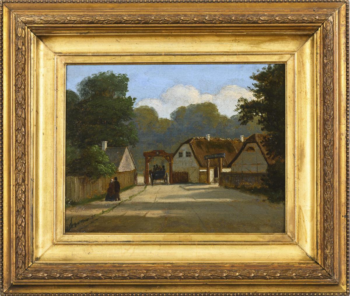 Village street with carriage leaving the village on a sunny day. Slight traces of age.