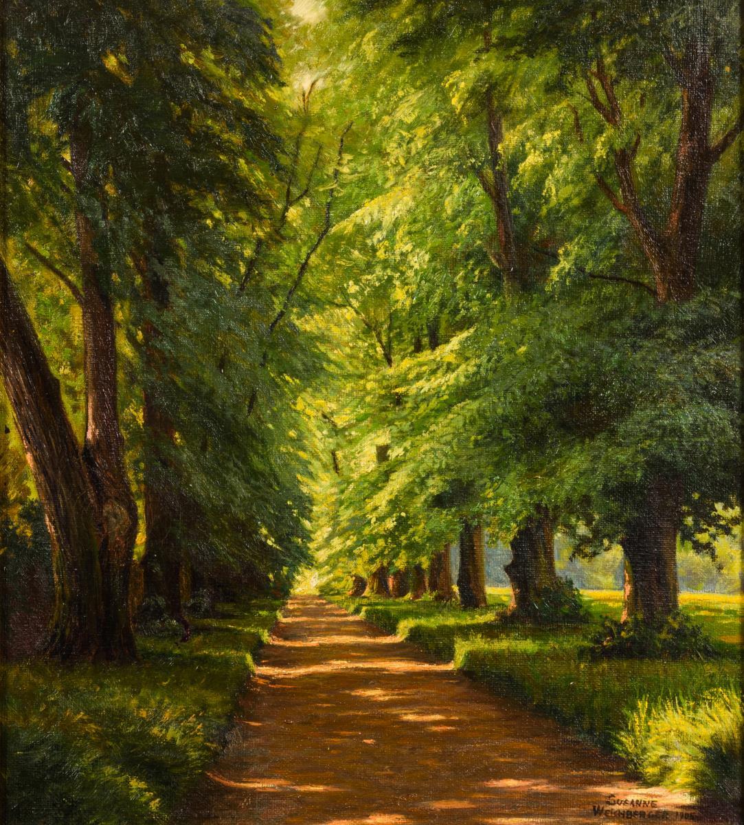 Weg unter Bäumen im Sonnenlicht