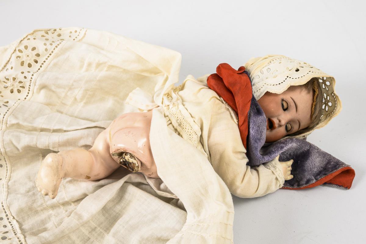 "My favorite baby". Cranked head, blue sleeping eyes, blonde fur wig. Sitting baby body made of mass. Long white dress, matching hood, purple cape. Wig fixed: head not x-rayed. Right leg missing. L 25 cm. With woven armchair, h 23 cm.