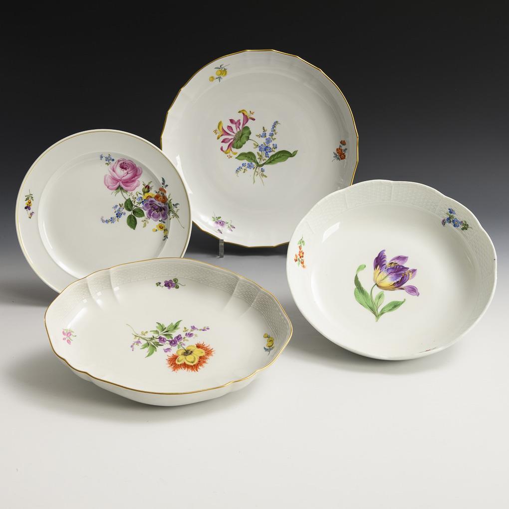 3 bowls and 1 plate with flower painting. Meissen.