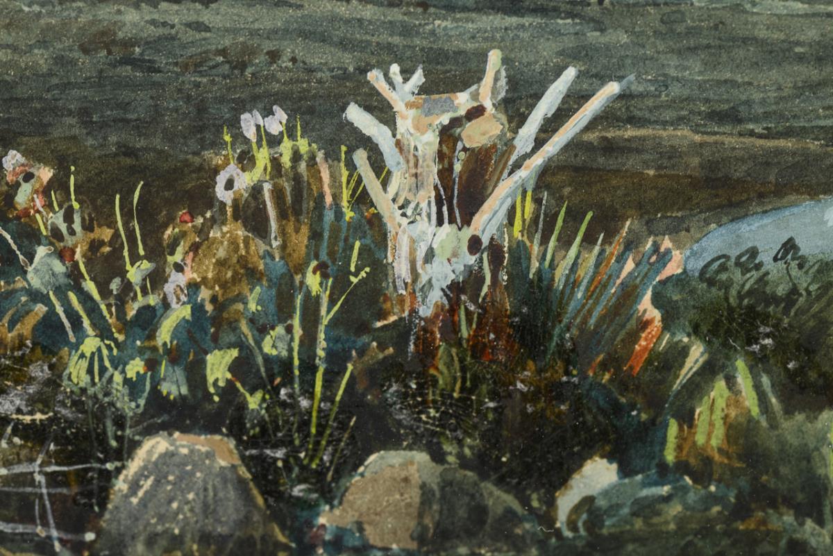Staffage figures in front of the croft with a view of the plain under a slightly overcast sky. Small tear to the edge, traces of age.