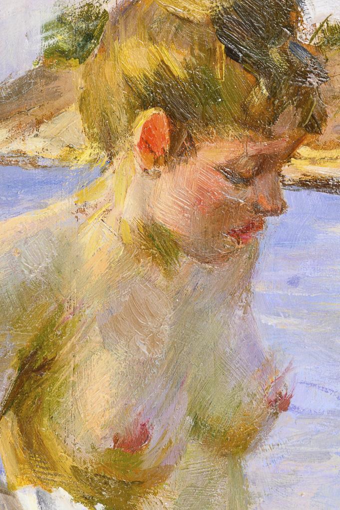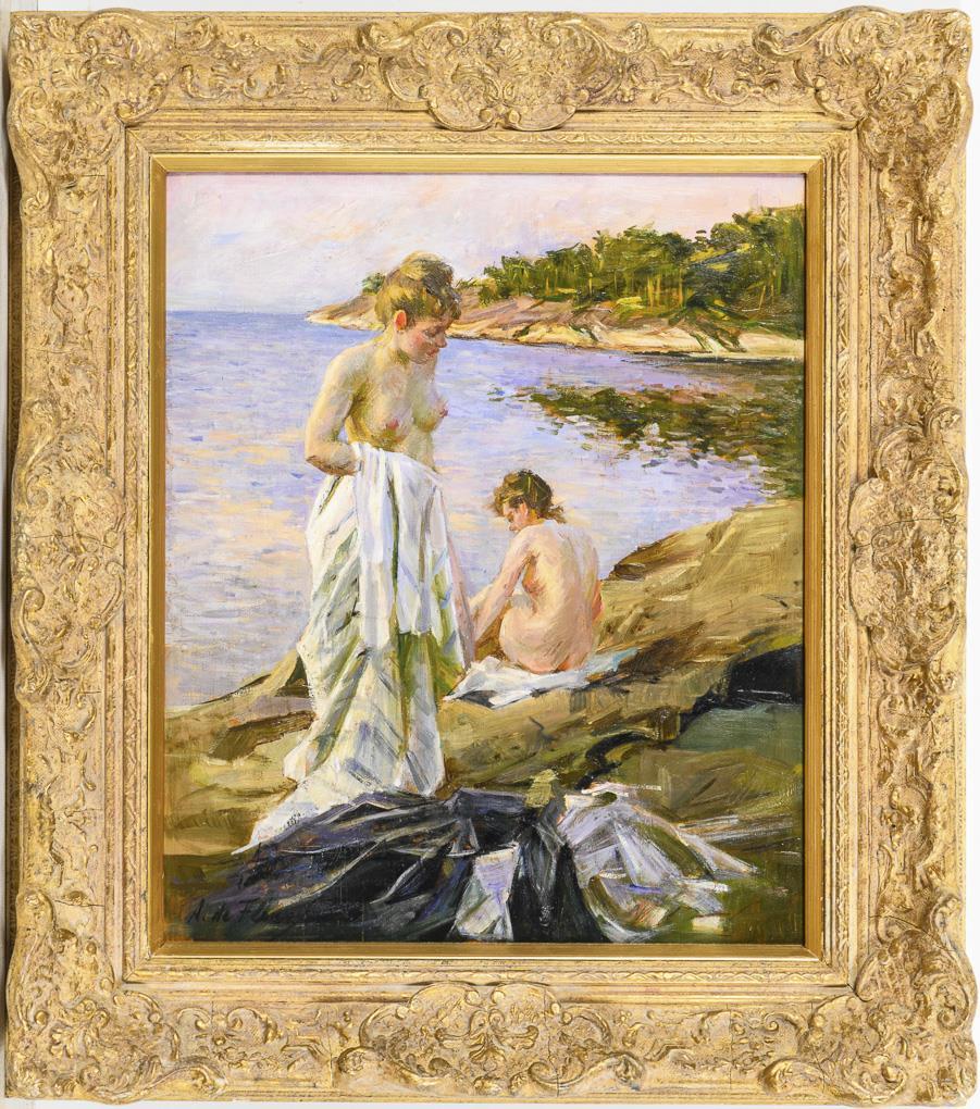 Two young naked women on the beach in the fading daylight with a view of the continuing coastline on the horizon.