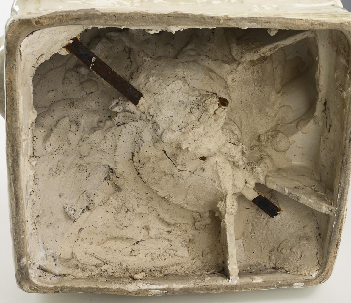 Expressive, sculptural animal figure, sitting on a book base. Restored, slight defects to the glaze in places.