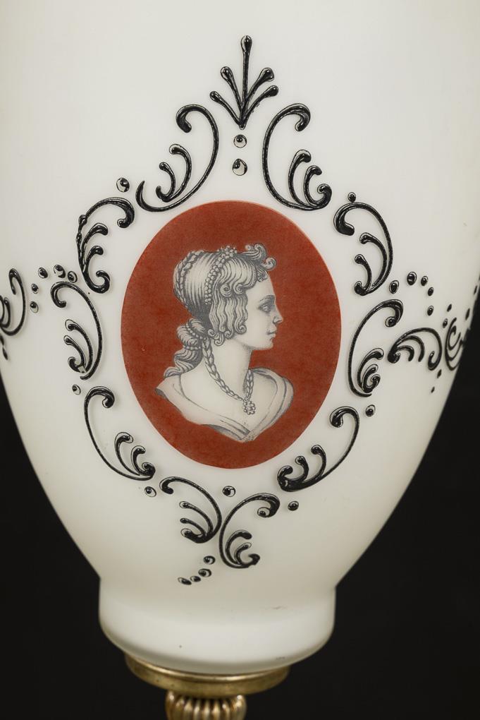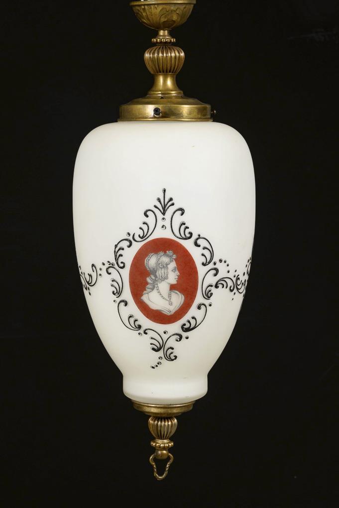 Vase-shaped glass body with all-round black ornamentation and 2 colored cartouches with various portraits of women. Relief brass mount and suspension. Function not tested.