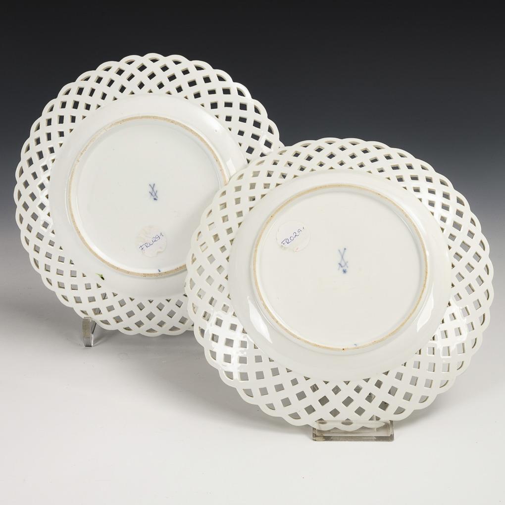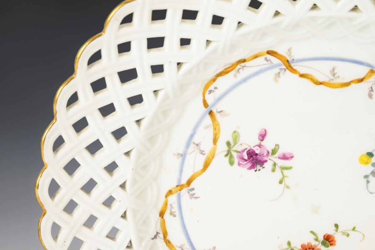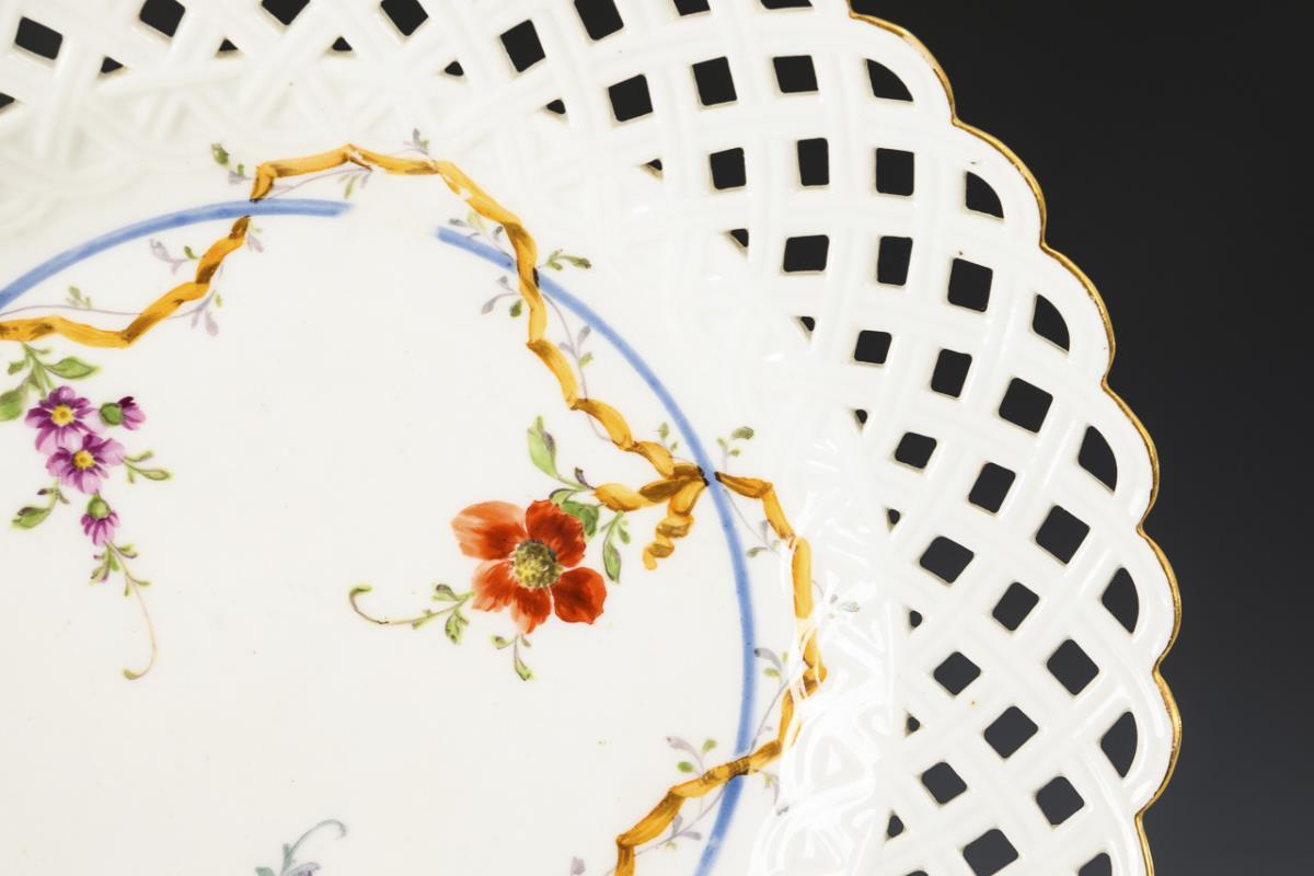 Dessert plate with basket-openwork flag, in the mirror a five-pass ribbon with flowers and leafy tendrils. Partially rubbed.