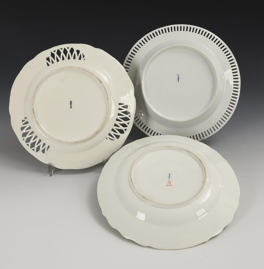 1x dinner plate, model "Neuozier" with flower and insect painting / 1x dessert plate, model "Reliefzierat mit Spalier und Lanzettbögendurchbrüchen" with lemon yellow partial background. / 1x dessert plate "Konisch". 1x gold rubbed.