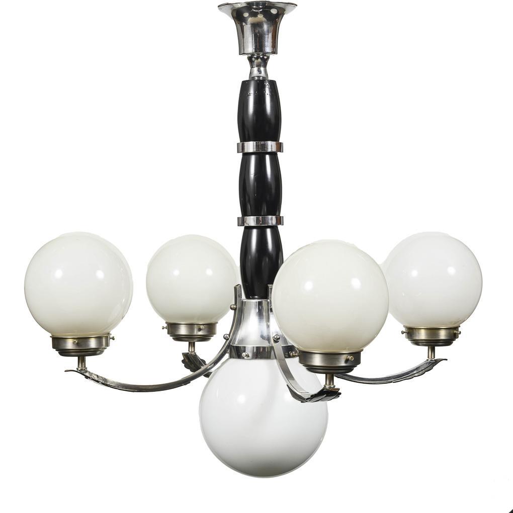 Column-shaped central shaft in contrasting black and silver and suspended large central spherical shade. Vertically mounted ball finials on the 4 bow arms with black leaf trimming. Function not tested.