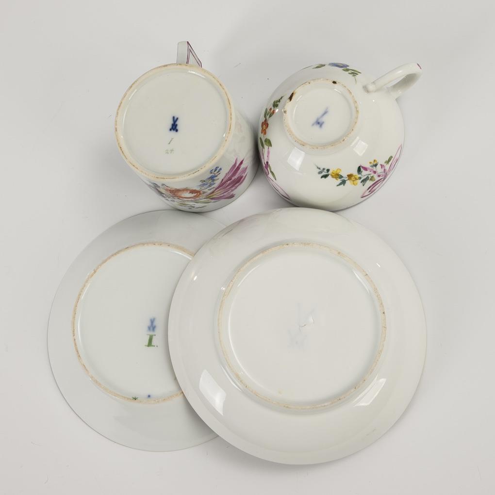 1x sword mark with dot, 1763-1774: bulbous cup with ear handle and bow-crowned flower festoons (H cup 4.5 cm, Ø original saucer 13.5 cm). / 1x Knaufschwerter with green inscription "I", 1816-1824: cylinder cup with angled handle and a bouquet of flowers on the front (h cup 6.5 cm, Ø original saucer 13.5 cm). 1x minimal gold abrasion and small knocks to the base ring of the cup.
