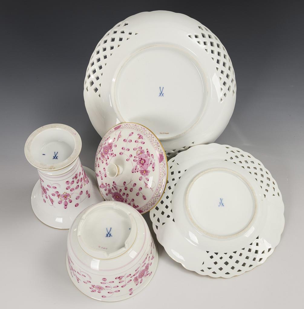 Can, vase, pierced plate and bowl "Indian Purple". Meissen.
