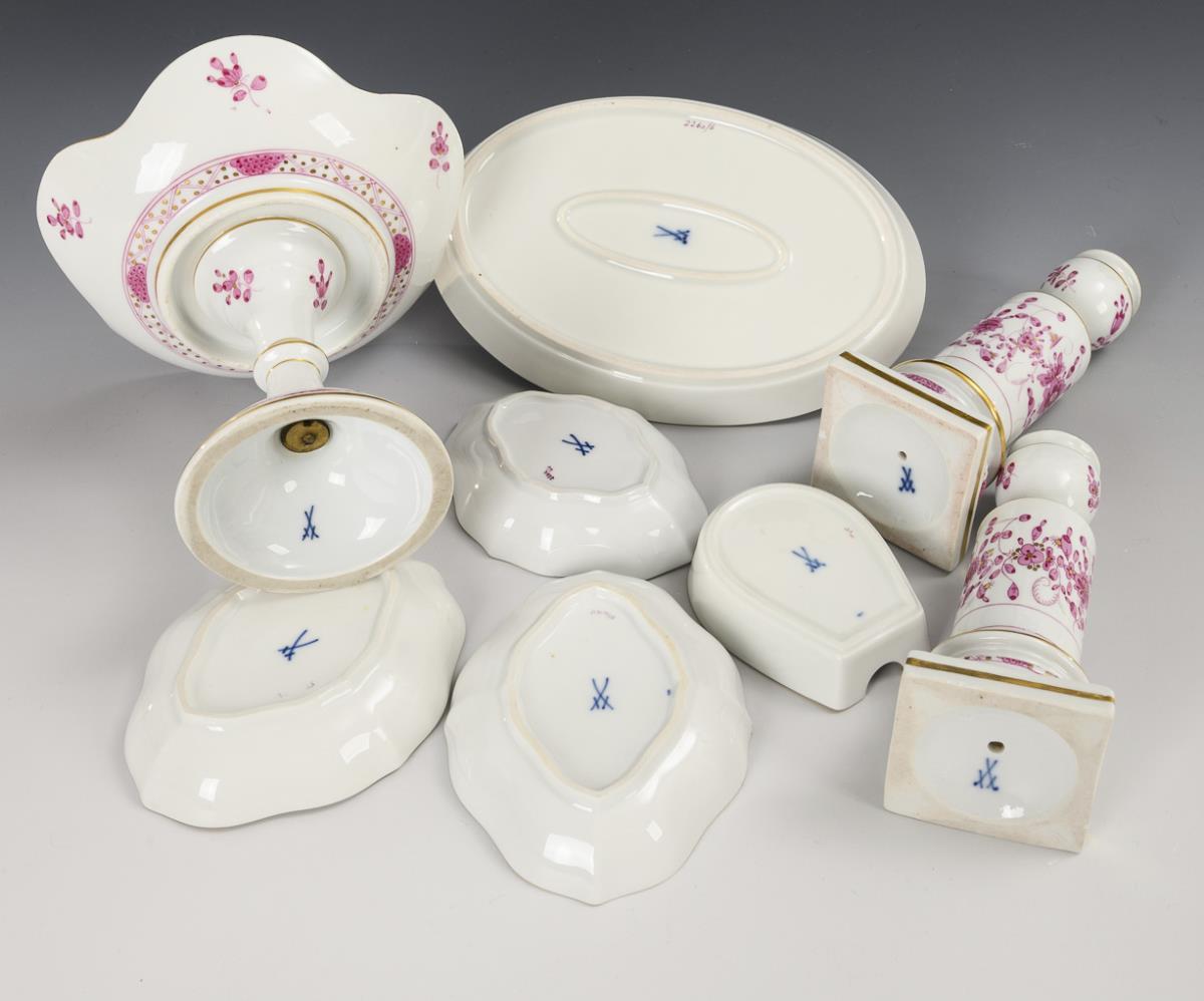 2 column candlesticks (H 14 cm), centerpiece (H 14 cm), small oval tray (L 18.5 cm), 2 + 1 quatrefoil bowls (L 2x 12 cm and 1x 10.5 cm) and 1 ashtray (L approx. 8 cm). Small chip to the underside of the stand of a candlestick.