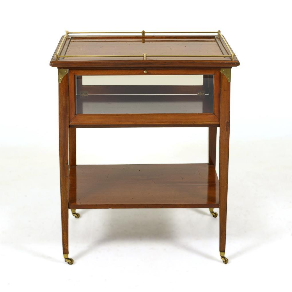 Tea trolley with display cabinet body glazed on 4 sides and display cabinet flaps opening to all sides with brass knobs, upper shelf with slight depression and surrounding brass railing, intermediate shelf, on 4 conical square legs with castor feet. Brass fittings. Cover plate with water and lacquer damage, slight defects in places.