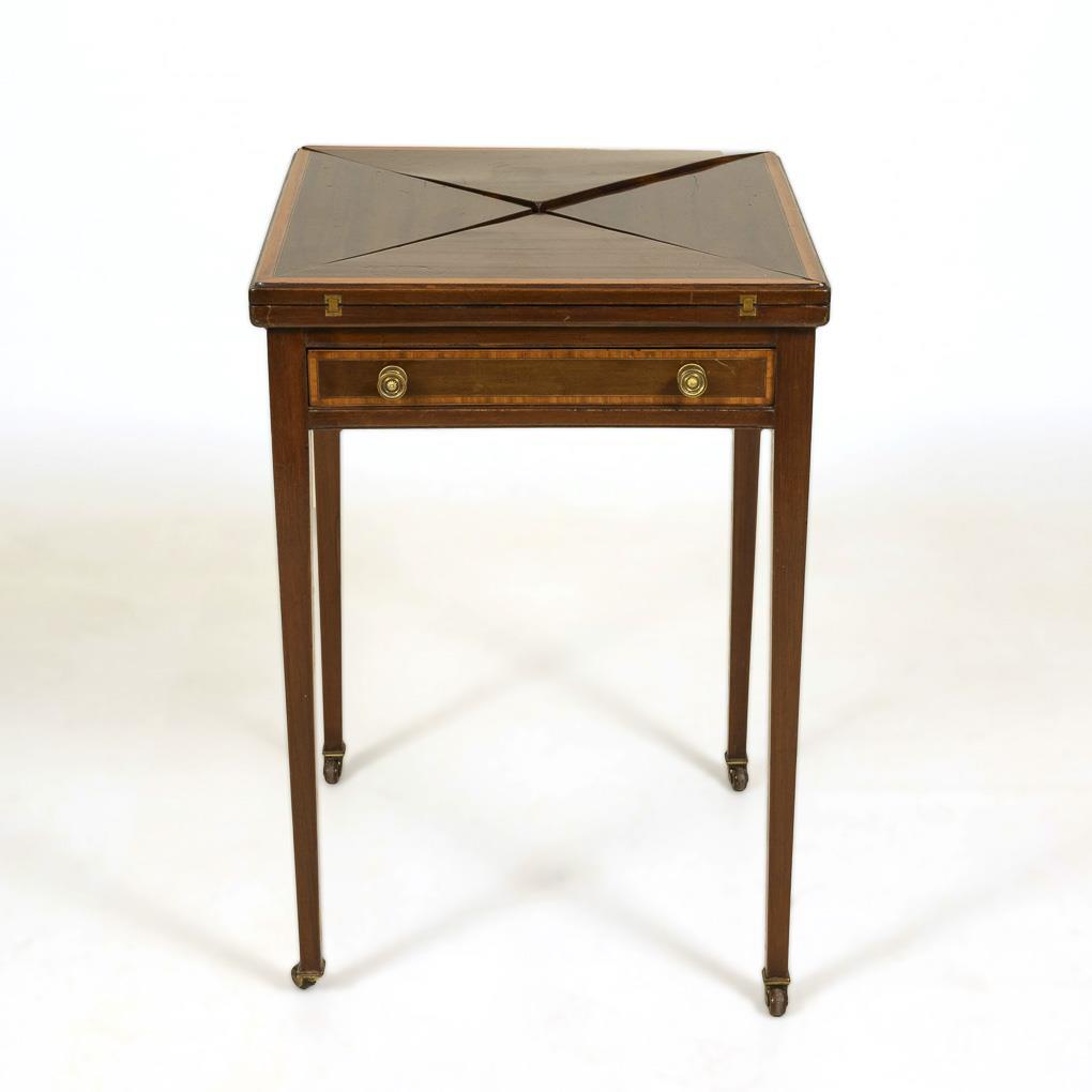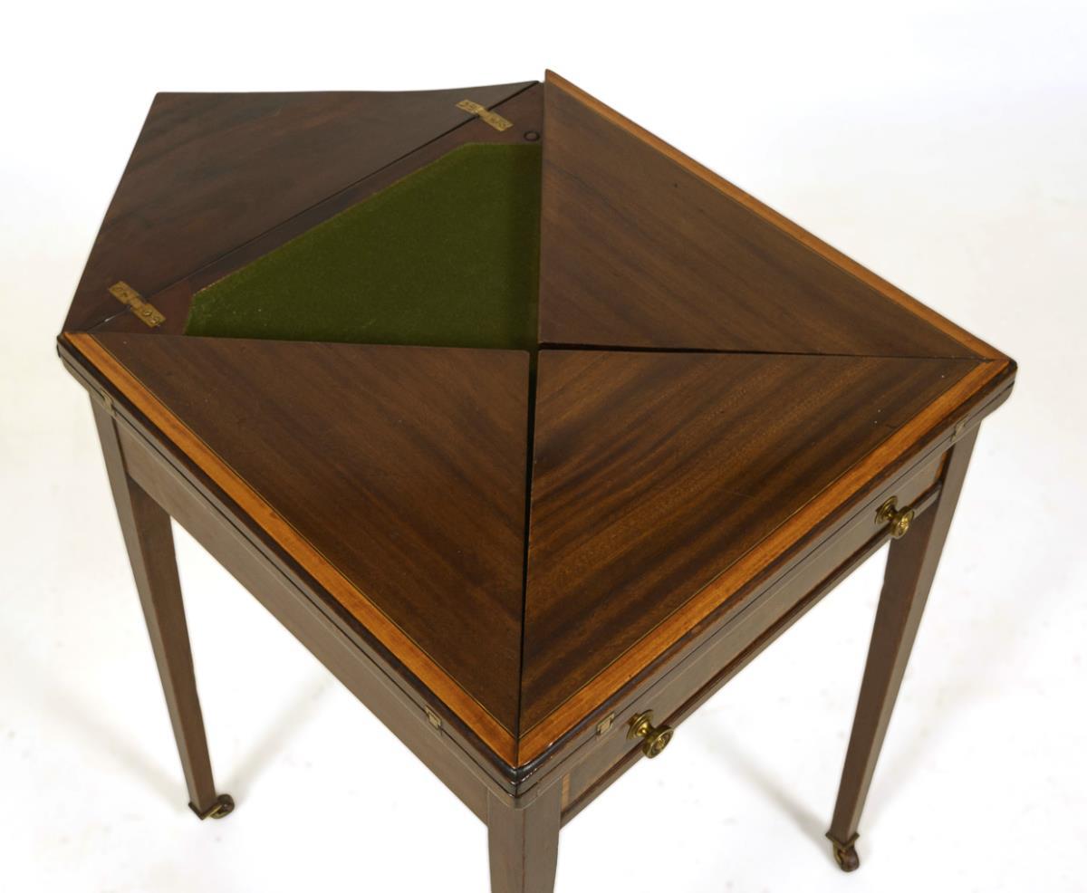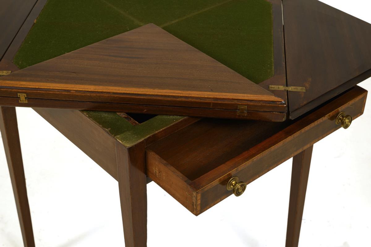 1-tier table with swivel top that folds out into four sections, green felt fabric inside in an octagonal shape. On pointed legs with castor feet. Brass fittings and knobs. Slight signs of age and use, minor defects in places, cover plates not quite flush-fitting.