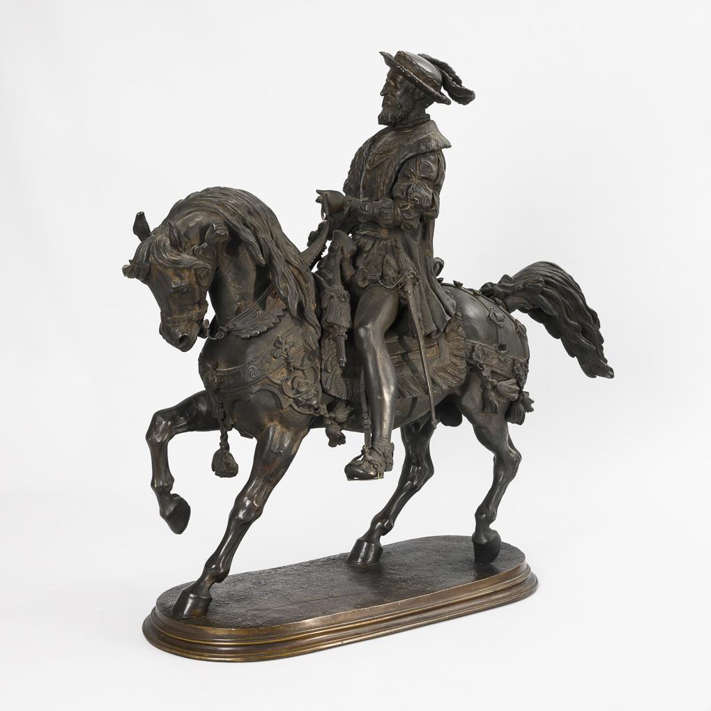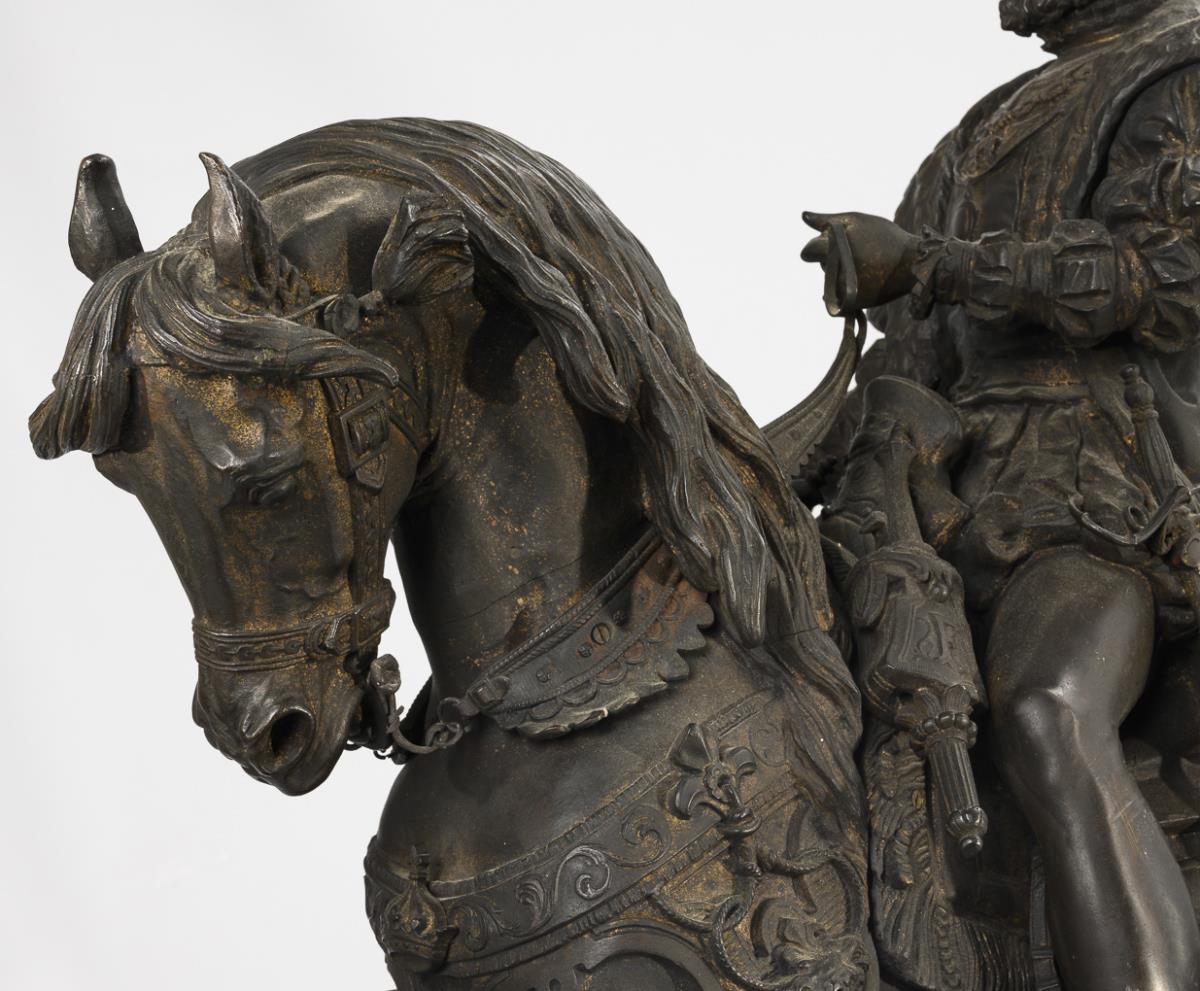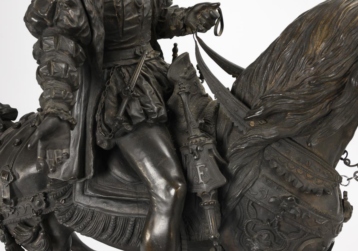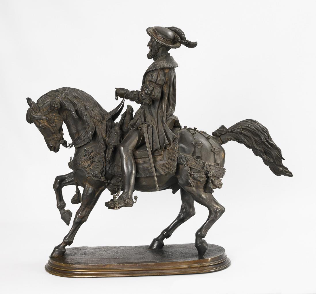 Equestrian monument of the French king (François Ier, le Roi-Chevalier, 1494 - 1547), riding the spirited stallion in a magnificent costume with feathered hat and wearing the collar of the Order of the Golden Fleece. Very detailed cast with numerous appliqués. Some loose mounts, leg and neck seam on the horse visibly with hairline cracks, 1 decorative flower missing from the rear harness, unobtrusive traces of a removed plaque on the plinth, some signs of age/use.
