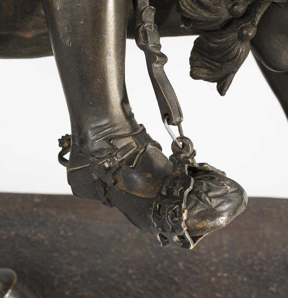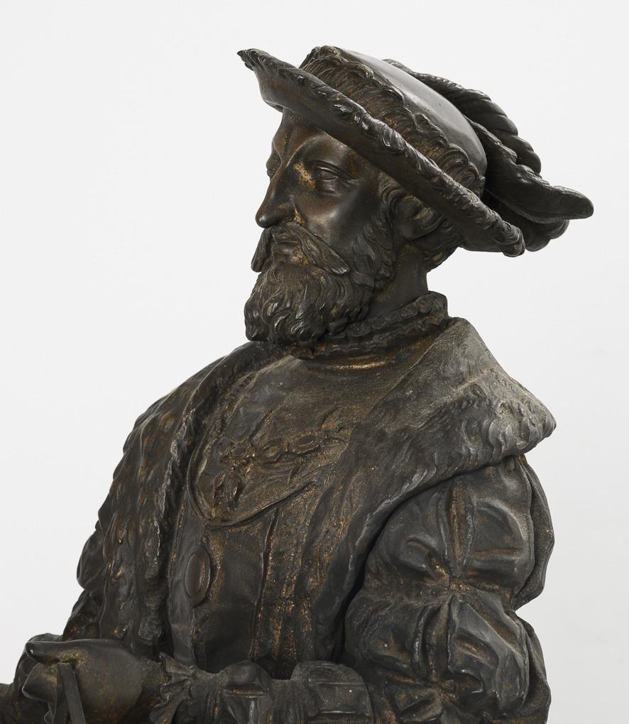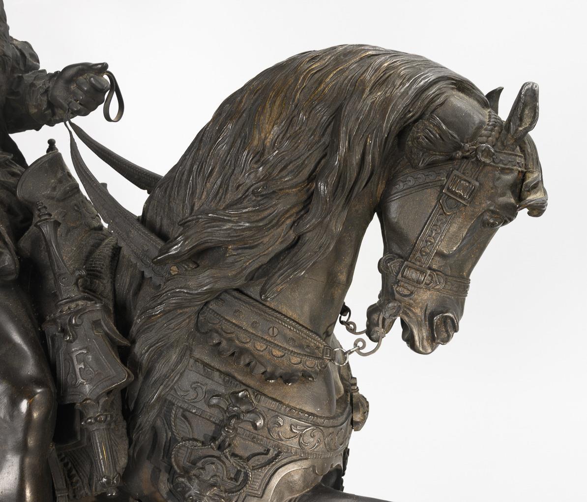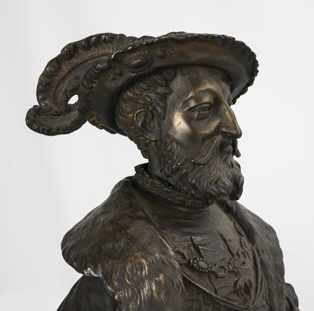 Equestrian monument of the French king (François Ier, le Roi-Chevalier, 1494 - 1547), riding the spirited stallion in a magnificent costume with feathered hat and wearing the collar of the Order of the Golden Fleece. Very detailed cast with numerous appliqués. Some loose mounts, leg and neck seam on the horse visibly with hairline cracks, 1 decorative flower missing from the rear harness, unobtrusive traces of a removed plaque on the plinth, some signs of age/use.