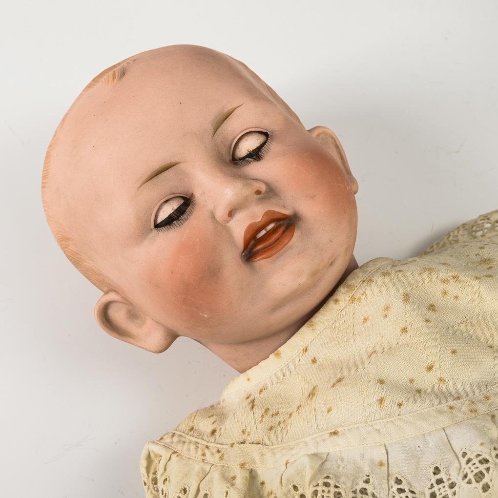 Full head, blue sleeping eyes, open/closed mouth with modeled tongue. Heavily rubbed, 5-part sitting baby body. Old, light-colored baby clothes. Chips on the left eye. Arms painted over, toes on the right with defects.