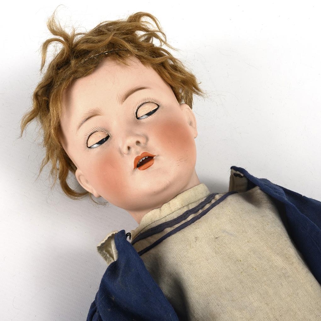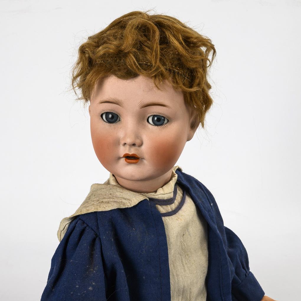 Cranked head, blue sleep/shelmet eyes, blond mohair wig with traces of age. 17-piece articulated body with raised knees. Old, dark blue dress with soiling, white shoes (solid). Head x-rayed: without defects. Eyelids painted over.