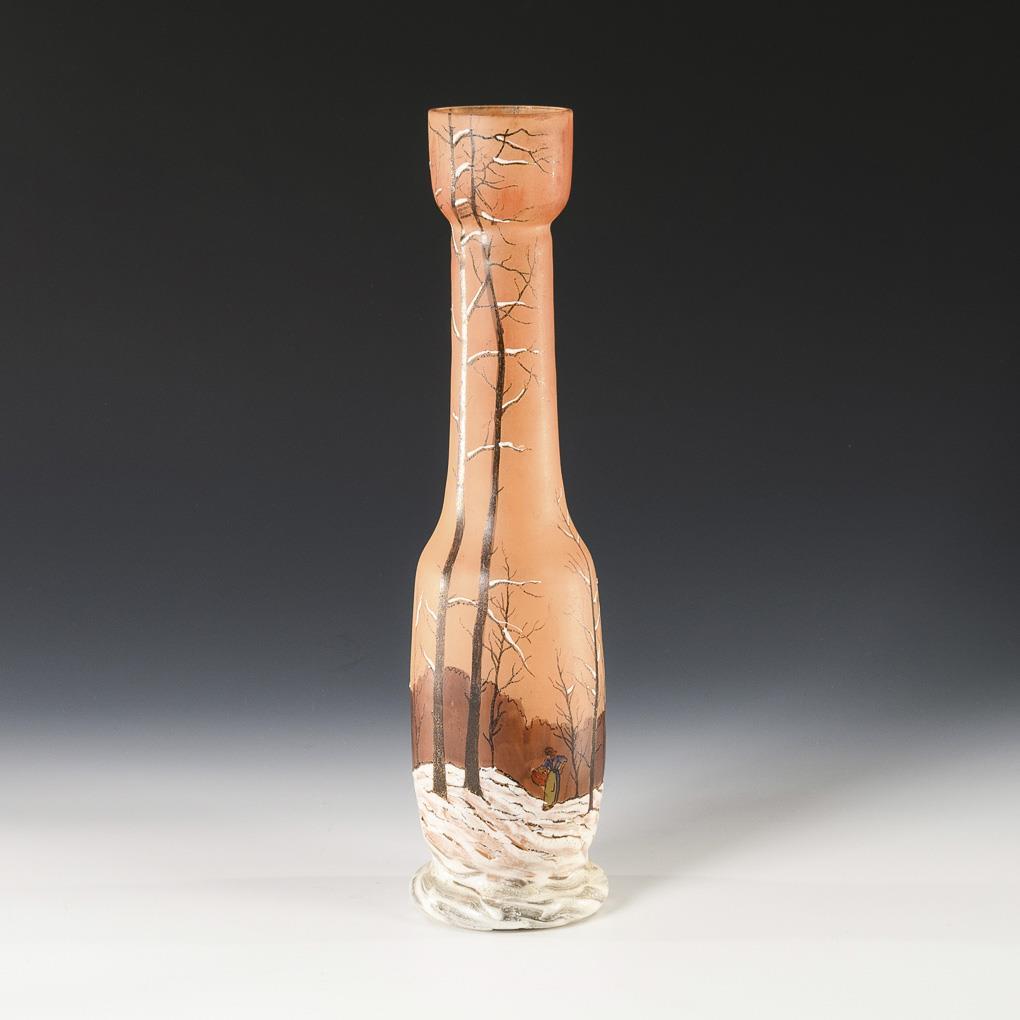 Baluster vase with flared stand, slender neck and cylindrical mouth. Surrounded by the depiction of a winter landscape with a woman.