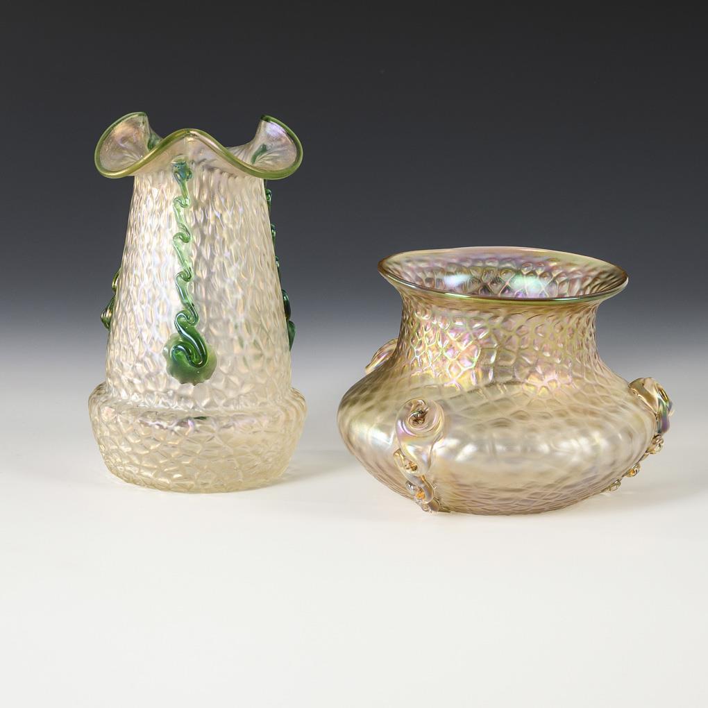 1x pressed vase with three maritime fusions in colorless glass (h 10 cm). / 1x conical vase with triple overlapping mouth and three maritime fusions made of green glass. Small, inconspicuous stress crack in 1 colorless fusion.