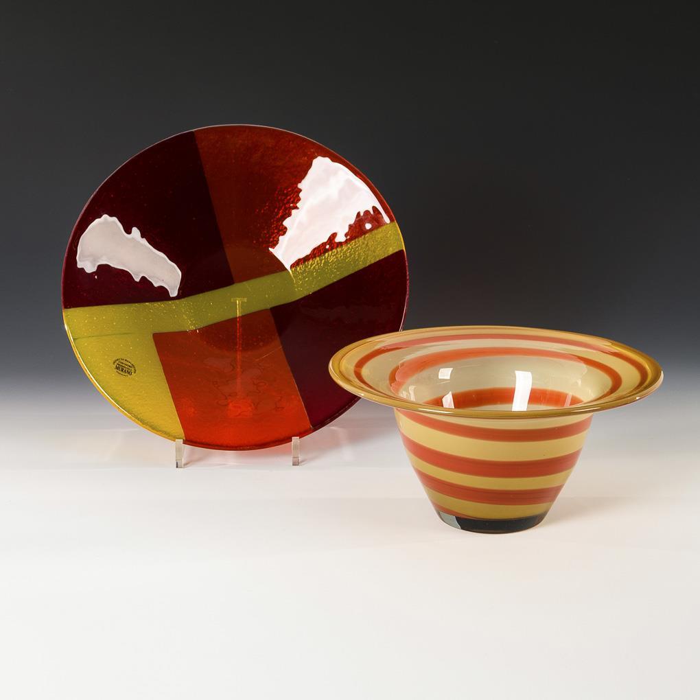 1x deep bowl of yellowish-white opal glass with colorless overlay and spirally fused, red opal glass band in the intermediate layer (h 12.5 cm, Ø 26 cm). / 1x conical bowl made of colorless, slightly bubbled glass with yellow, orange and red fused color areas (Ø 31.5 cm).