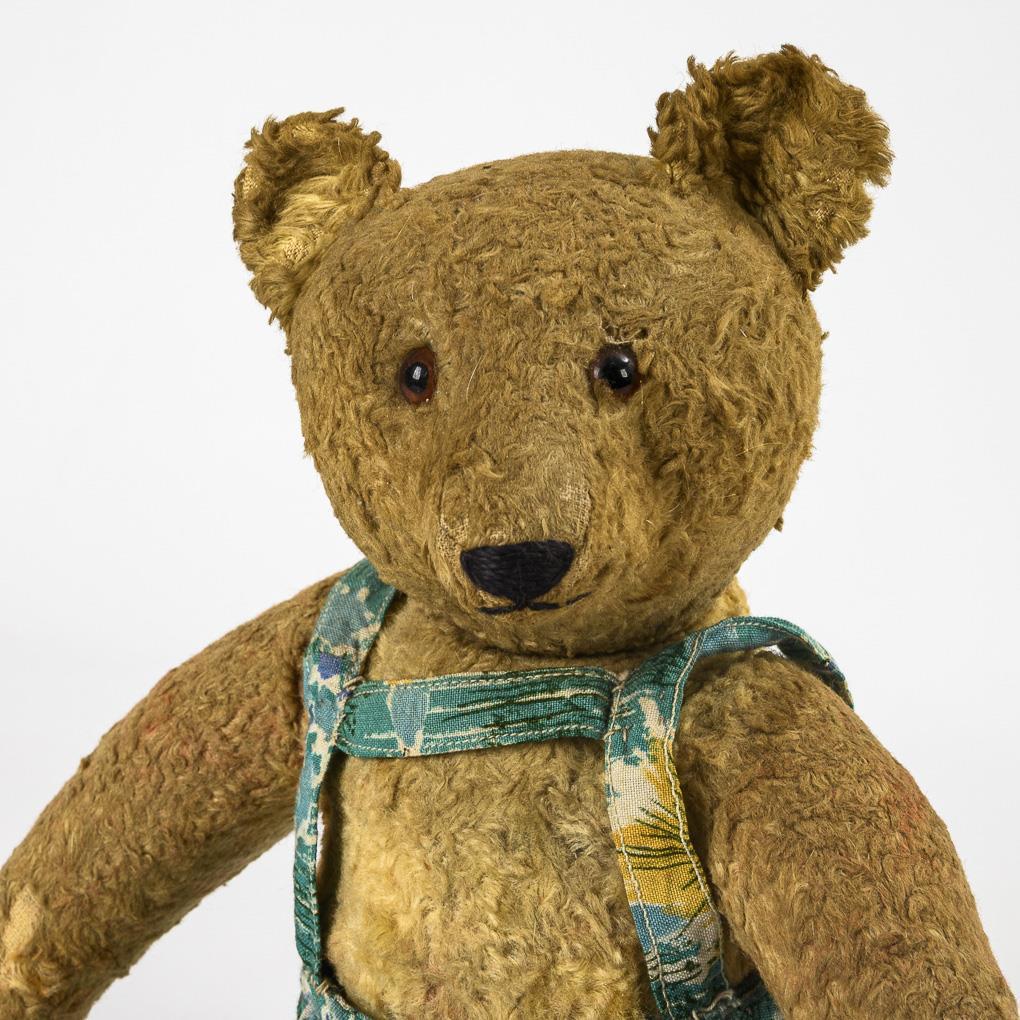 Steiff teddy bear made of blond artificial silk plush, with long arms, original fabric paws and green patterned trousers, l 35 cm. / Small yellow teddy bear made of artificial silk plush, l 16.5 cm. / Yellow mohair bear with blue clothing, l 36 cm. All worn, with varying degrees of age.