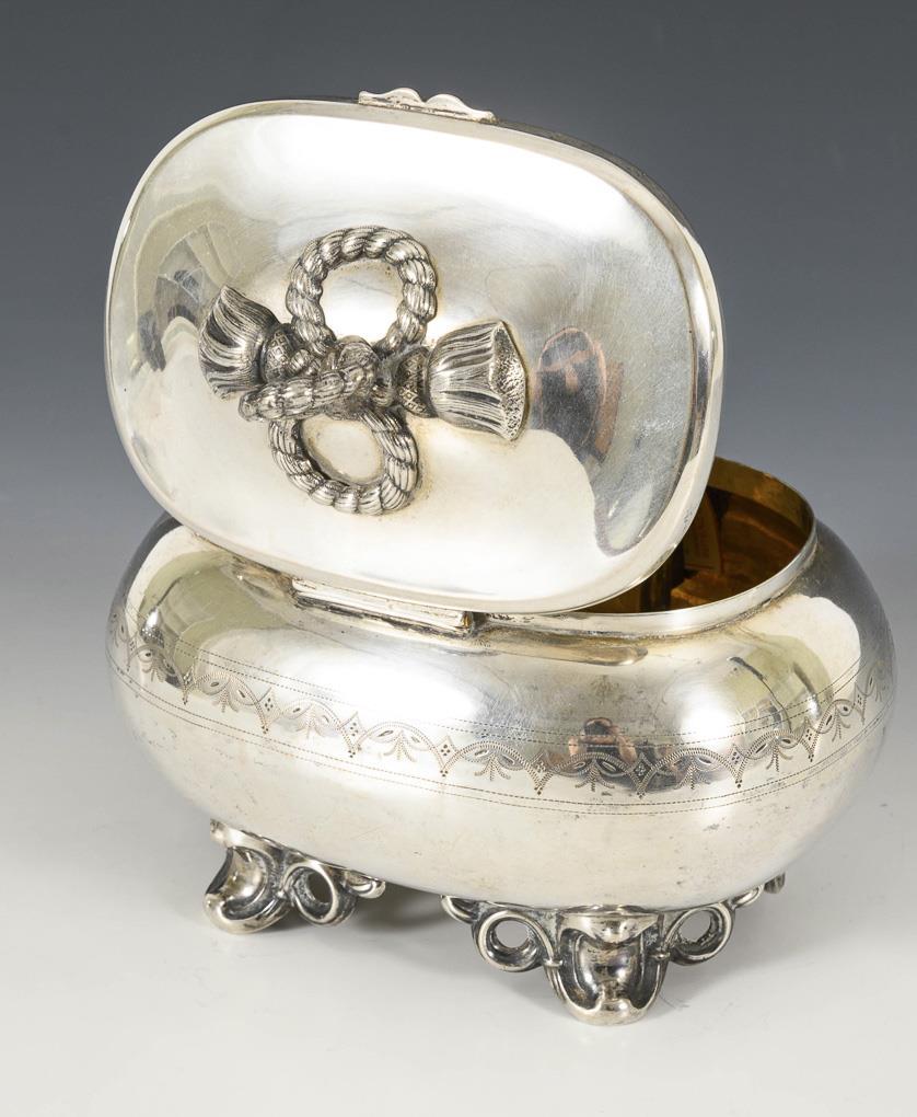 Closable, oval box with fine engravings and plastic cord knob. Dated on the underside: "d. January 4, 1877. I.S.". 1 key. Some small dents, 1 nut in the lid missing.