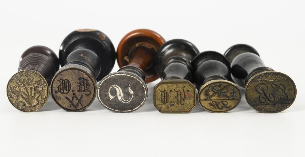 Turned handles, engraved typars with various monograms, 1x with aristocratic coat of arms, 1x with Masonic symbol, 1x with guild sign of the toymakers. 2x dry cracks, otherwise some signs of age/use.