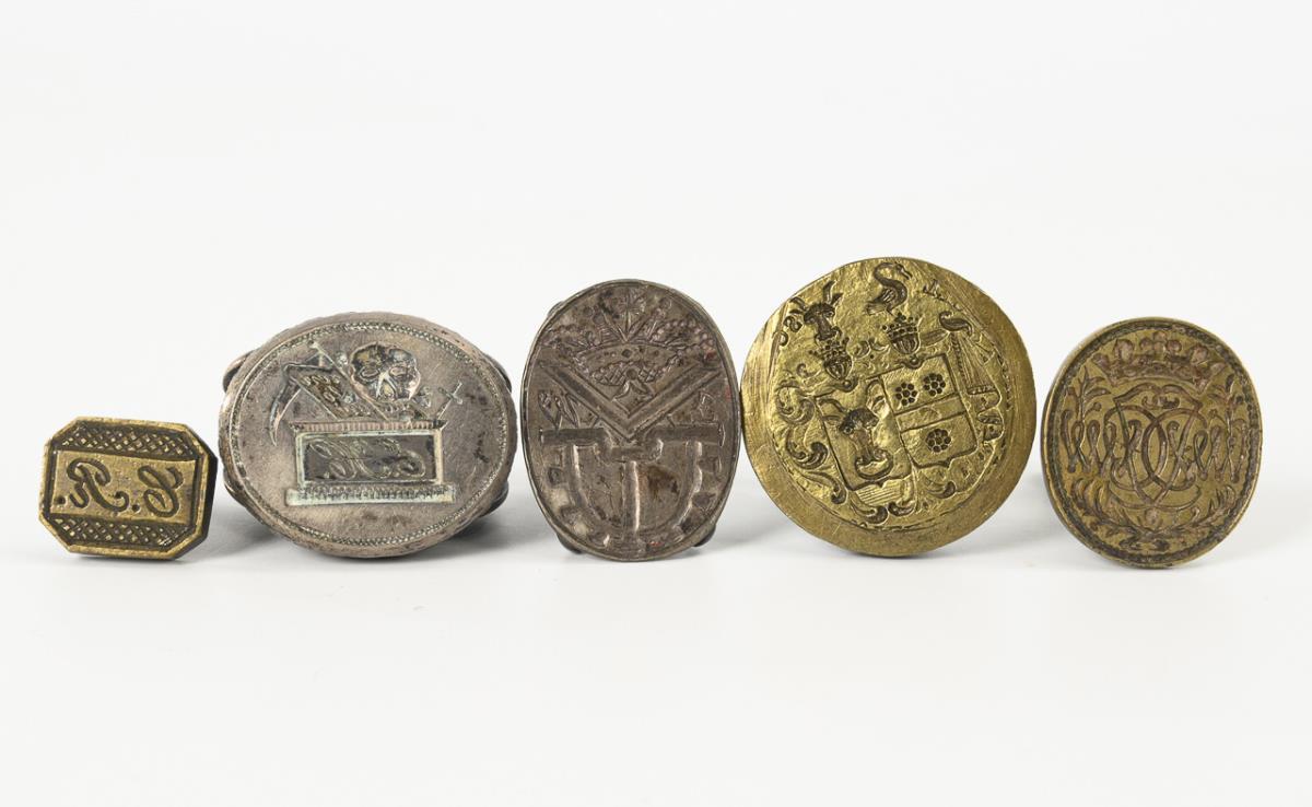 Silver-plated Biedermeier bell with engraved vanitas motif and monogram "EH". / Bell with engraved symbols of angle, compass and wheel (Freemason?) and monogram "JW". / Baroque brass seal with intertwined mirror monogram under a noble crown / Seal with alliance coat of arms / Typar without handle with engraving "CR". Alliance coat of arms inscription erased, otherwise some slight signs of age/use.
