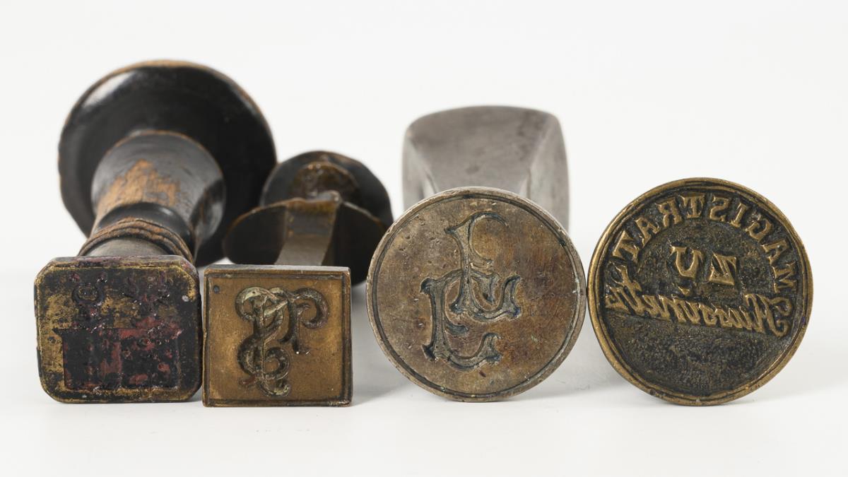 Plain silver shaft with monogram "EL", shaft with wooden handle and alliance coat of arms, hermen bust of a fisherman with monogram, seal of the magistrate of Hussinetz (Bohemia). Some signs of age/use.