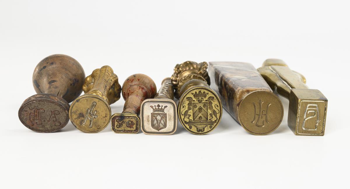 Screw-off handle made of sheet silver with embossed motifs: love altar and mother with child. Engraved coat of arms with old aristocratic crown on the typar / Column pedestal with baroque vase; engraved aristocratic coat of arms / Mummy with engraved monogram "AS". / Claw ball handle with monogram "JH". / Marble handle with monogram "JH" on brass typar. / Wooden handles with engraved indistinct monograms. Silver more heavily polished and slight dents, wood each missing lacquer and 1x with hairline crack.