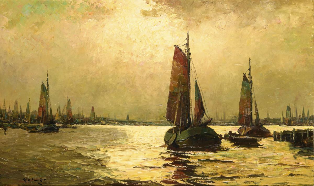 Sailboats in front of a harbor panorama in atmospheric light. Slight signs of age and wear.