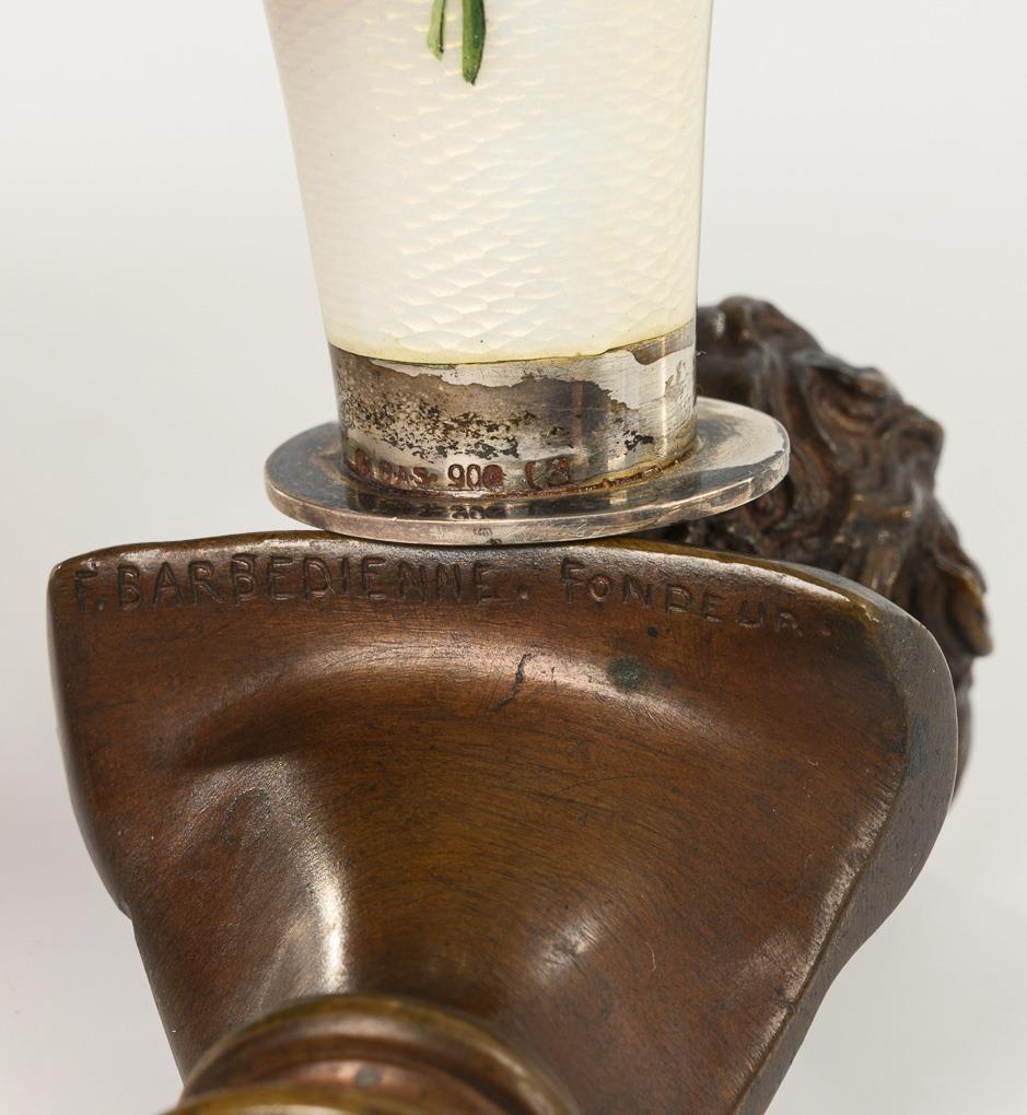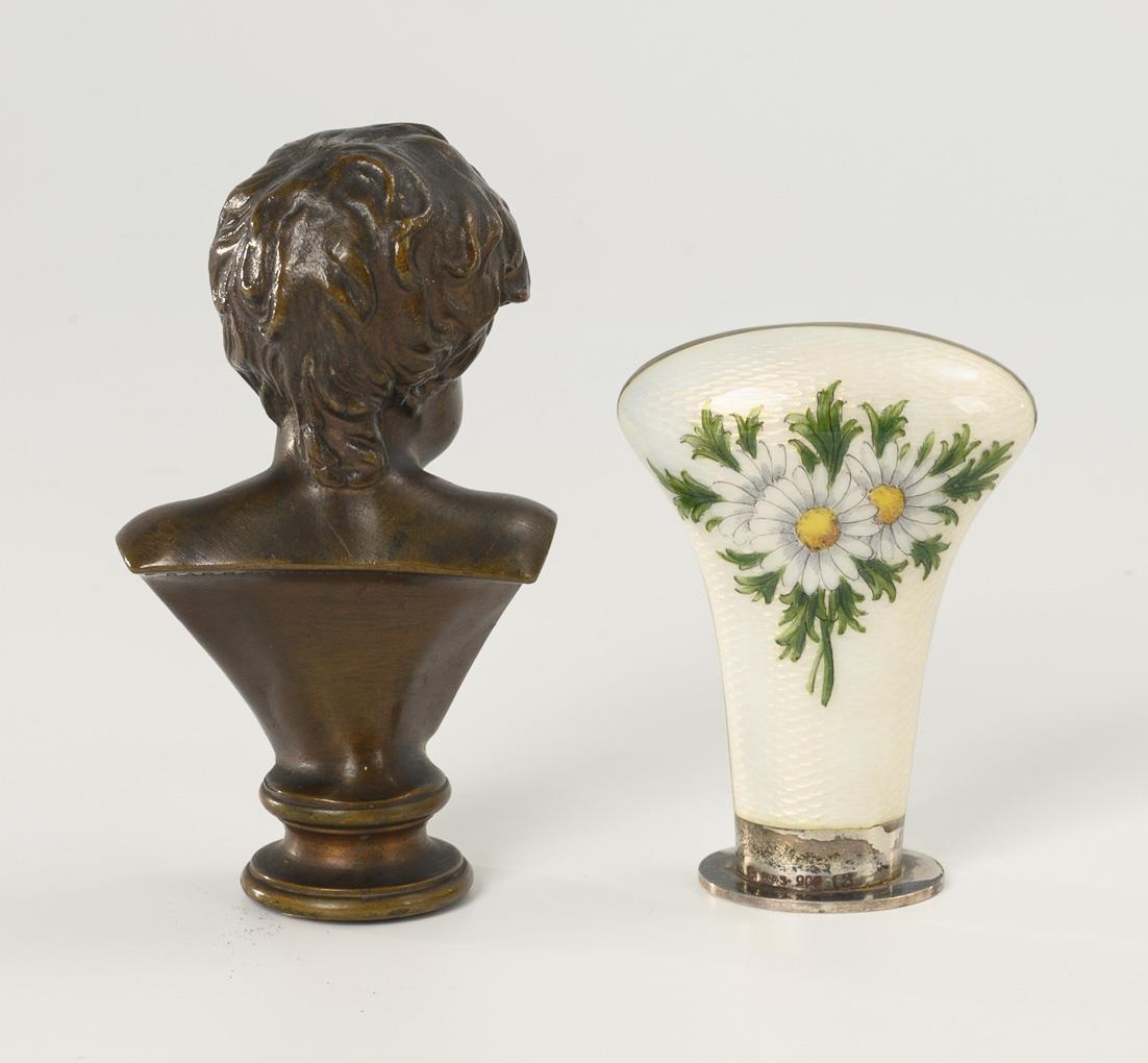 Silver with translucent white enamel and enamel painting over guilloche. Patinated bronze. H 7 and 9 cm respectively. Silver shaft 105 g.