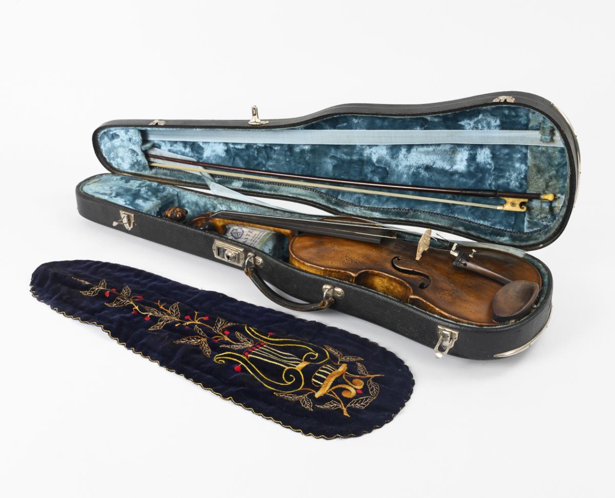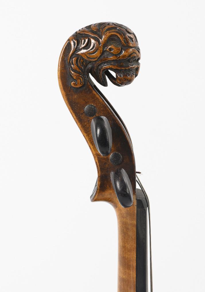Violin with carved lion's head in place of the scroll. Bow with round stick and bone frog with carved volute and frog screw made of bone. Accessories: 2 mutes, 1 tin of rosin ("Gustave Bernandel"), tuning pipe, some strings. Black case inside with blue plush and embroidered protective cover. Small glued cover crack at the sound hole, nicks on the body. Bow and case with some signs of age/use.