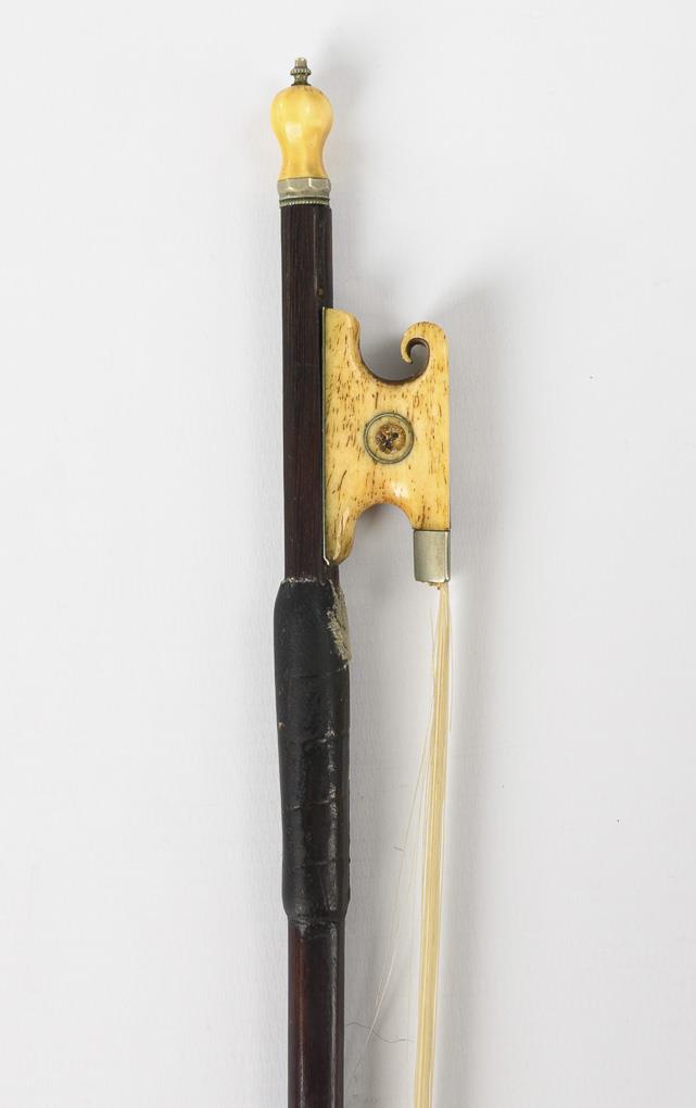 Split maple back and split spruce top, ebonized fingerboard. Pernambuco(?) bow. Body 35.5 cm, bow 72 cm.