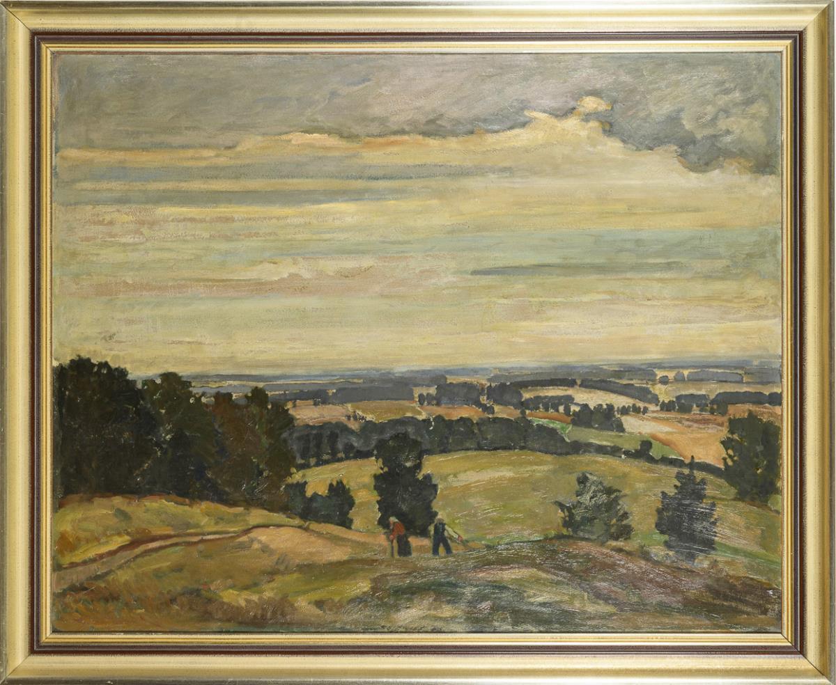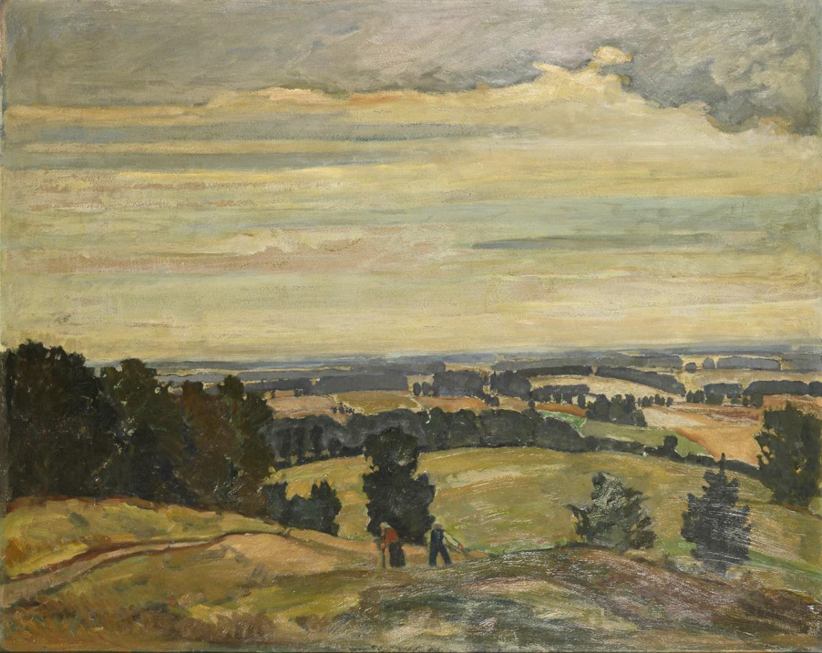 Mowing farmers in the fields with a view over the wide hilly landscape under a cloudy sky. Slight traces of age.