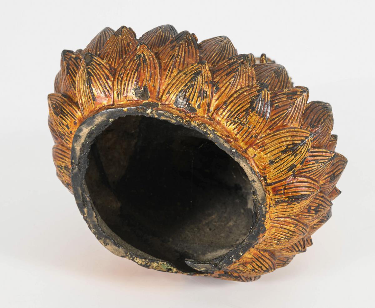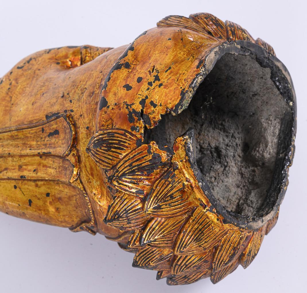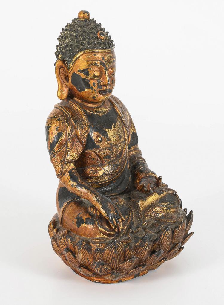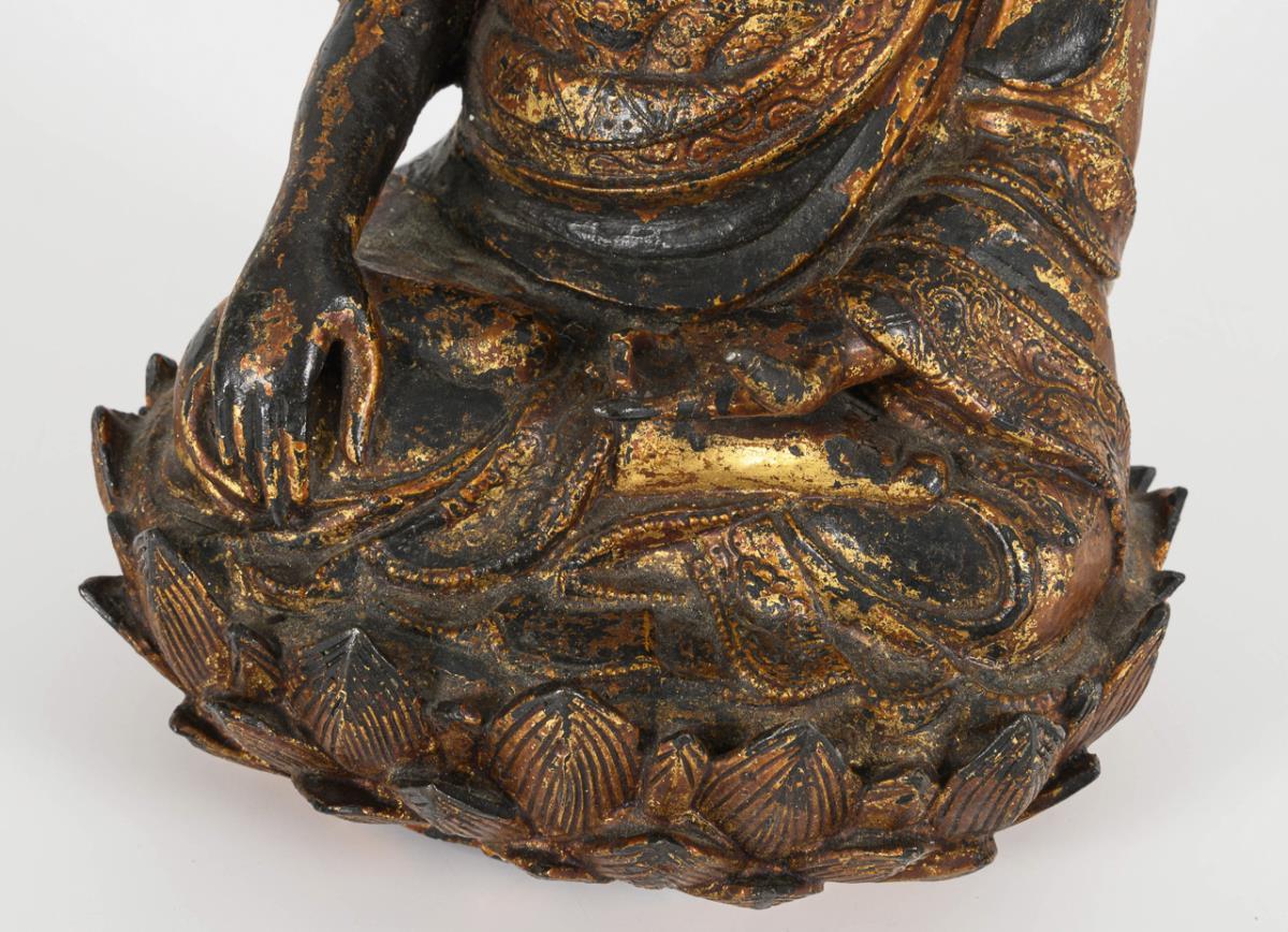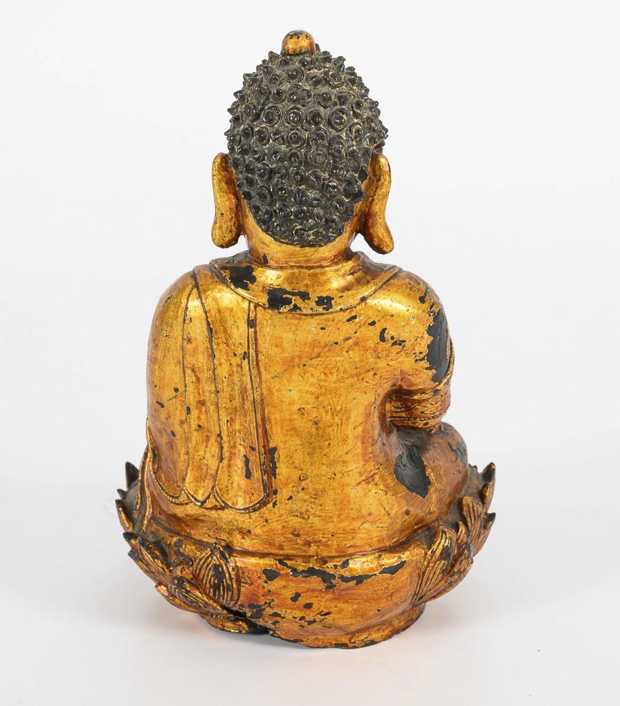 Beautiful sculpture of a Buddha resting in an entangled seat, with the gesture of touching the earth. The gold-colored frame heavily rubbed. Small chip to the lower back edge.