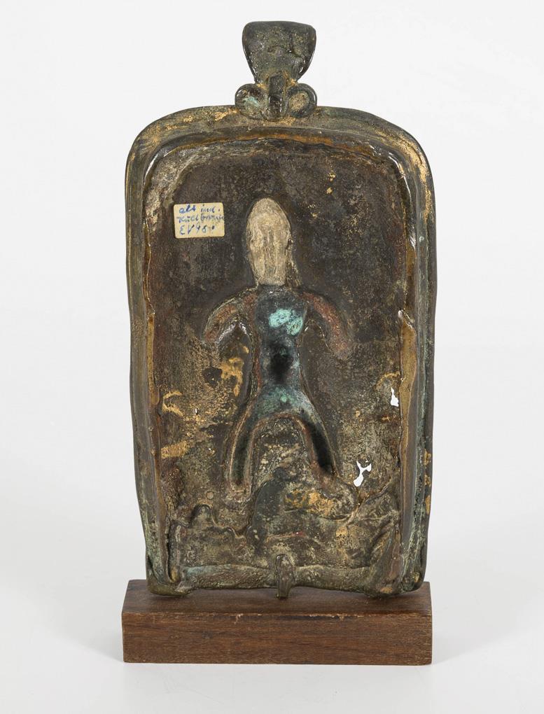 Strongly stylized figure relief, crowned by a cobra, on a younger wooden base.