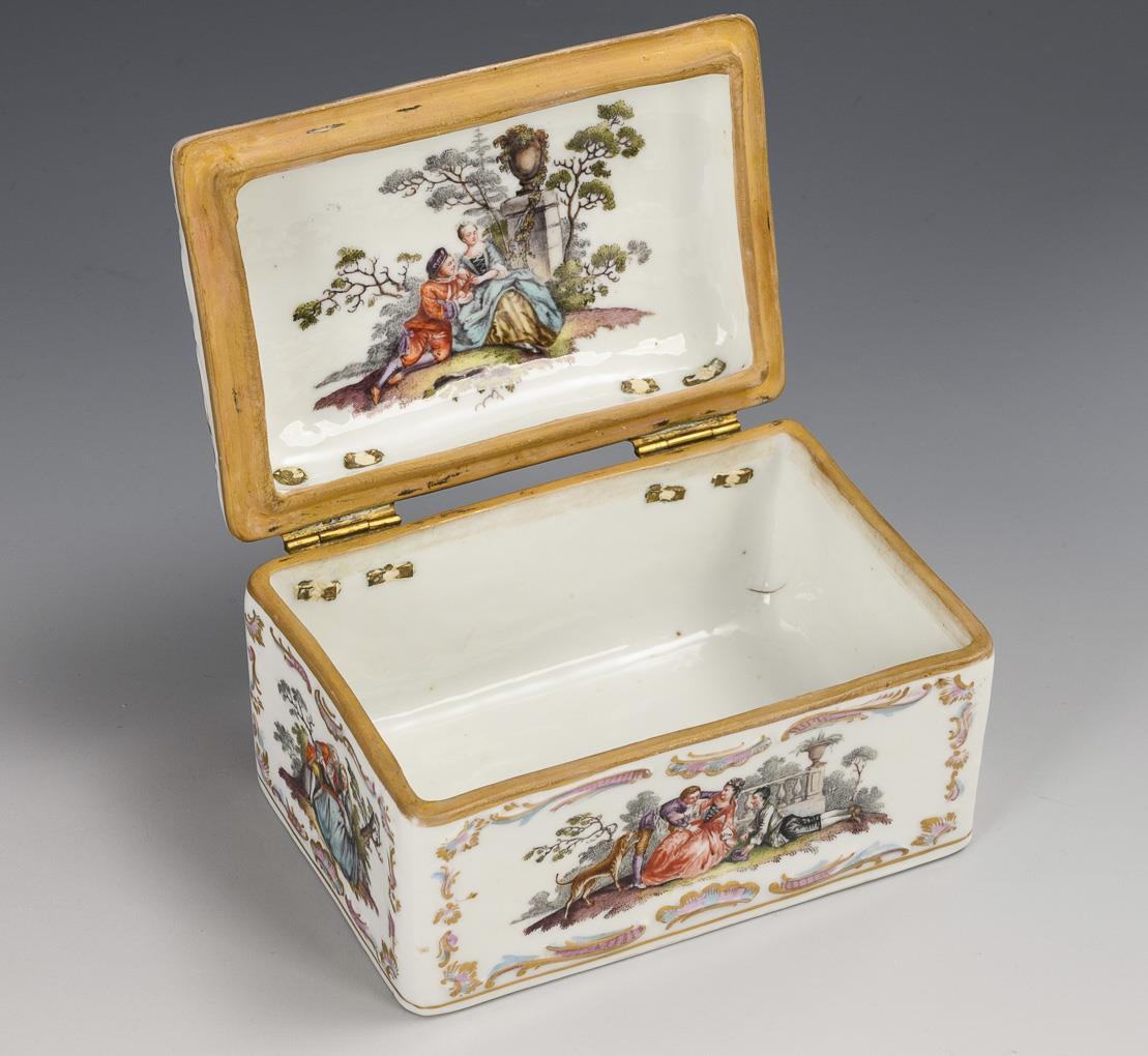 Tall rectangular box with slightly domed hinged lid. On the lid and all sides gallant scenes in relief rocaille framing; in the lid another couple in a park landscape. Inside small (not continuous) fire crack in one corner.