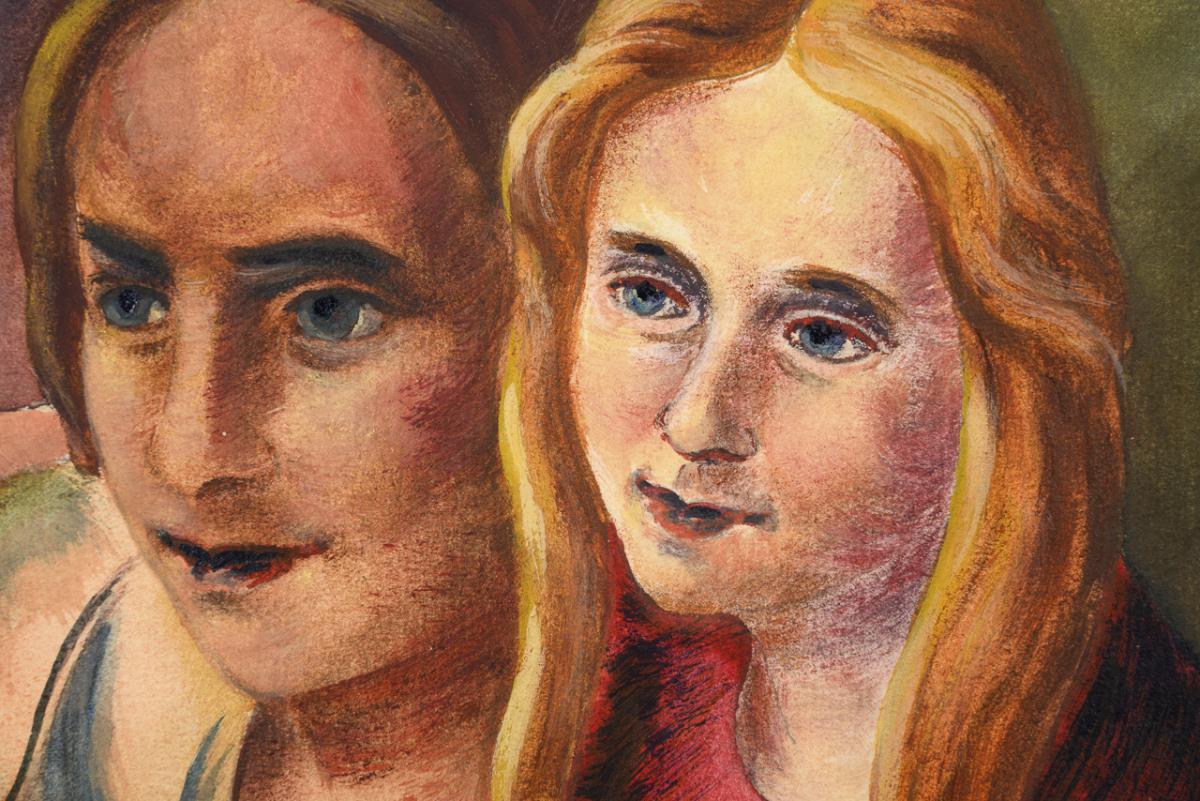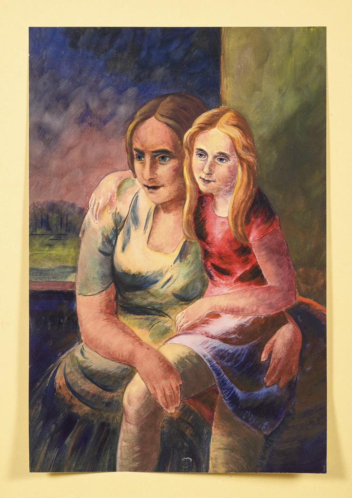 Portrait of the mother with the child on her lap at the open window. A small restored area.