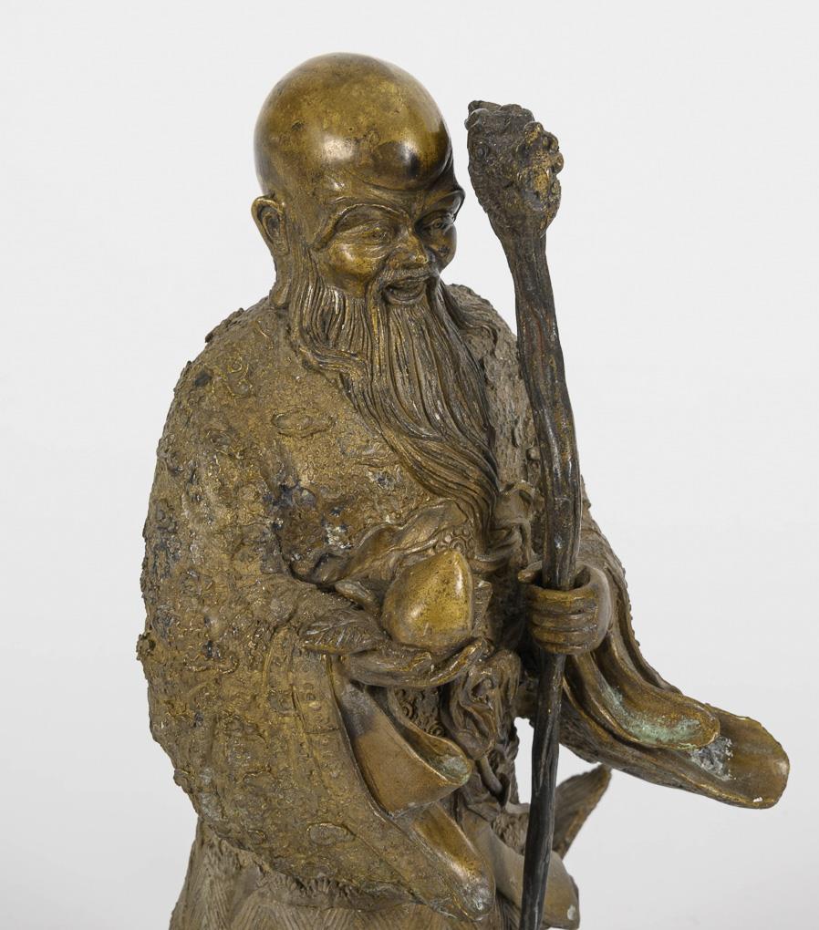 Very beautiful, detailed sculpture of an old man standing on a turtle with dragon head, holding a peach and a staff with dragon head in his hands.
