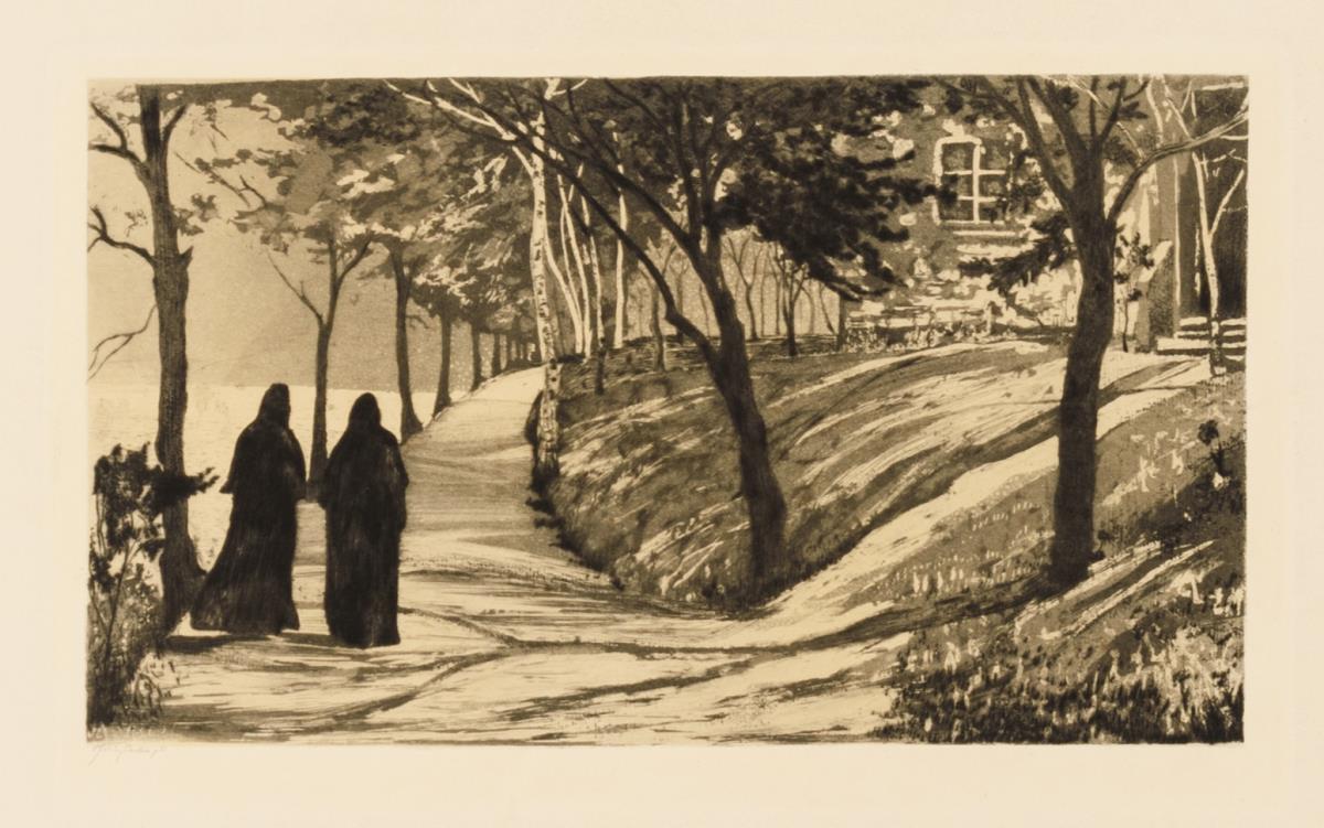 Schattiger Uferweg mit zwei verschleierten Figuren.