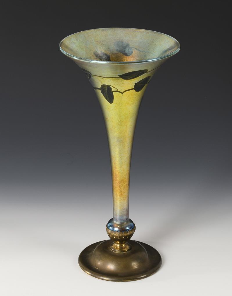 Funnel vase with leaf decoration and mounted bronze foot;.