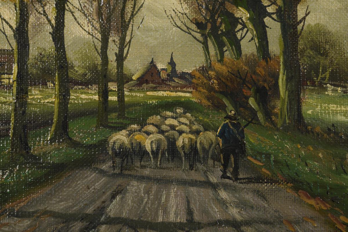Wide road with bare trees and the shepherd with the cattle towards the village under a gray sky. A small hole.