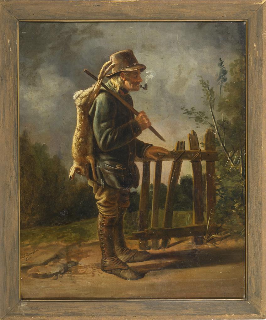 Old hunter in the evening sun with the hare on his shoulder at the garden gate. Retouched.
