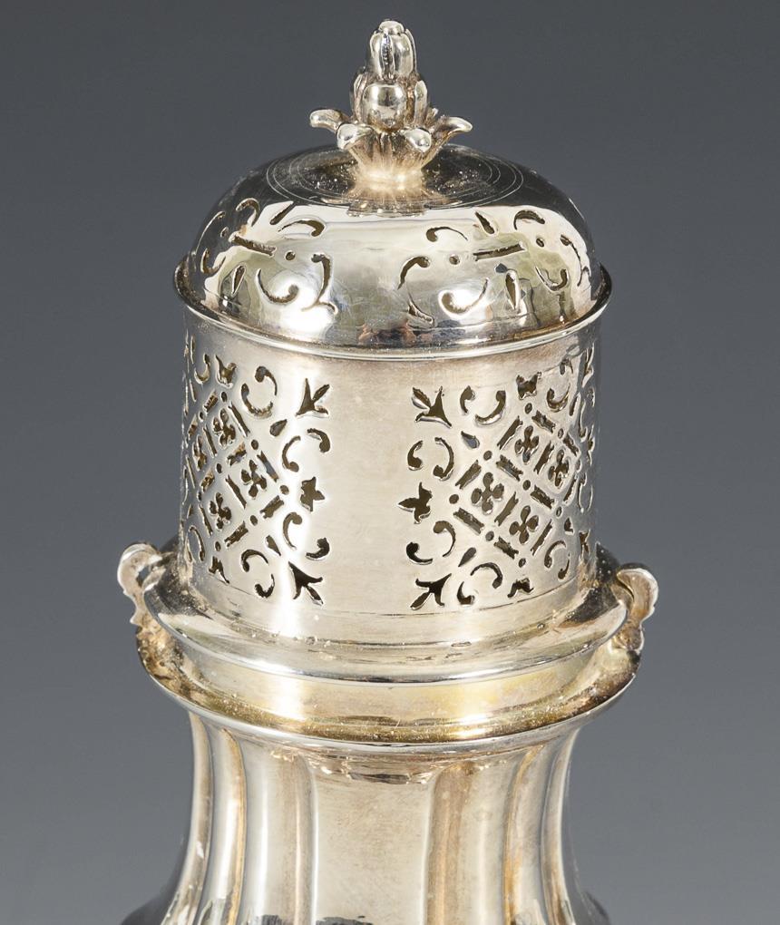 Baluster-shaped shaker with ornamentally sawn-out plug-in lid and bud finial. Small solder points.