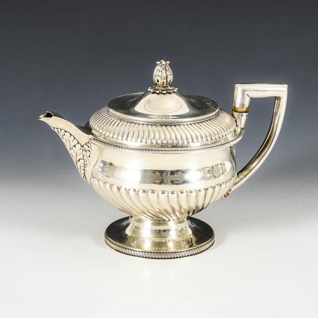 Partly ribbed, Georgian teapot with angled handle and floral knob. Hinged lid defective, with probably old repair to the inside.