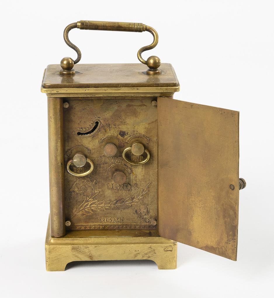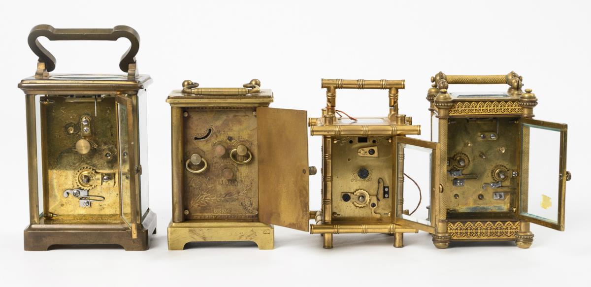 Brass and bronze cases, glazed on several sides, each with carrying handle, partly visible balance with cylinder escapement on top. 3x key-wound movements, 1x hand-wound movement, 3 watches functional in short time test, travel clock "Elliot & Son" not running. White, partly marked enamel dials with Roman or Arabic numerals, partly painted in color, 1x with putti decoration "Elliot & Son London". Signs of age and wear, partly defects, 1 hand missing.