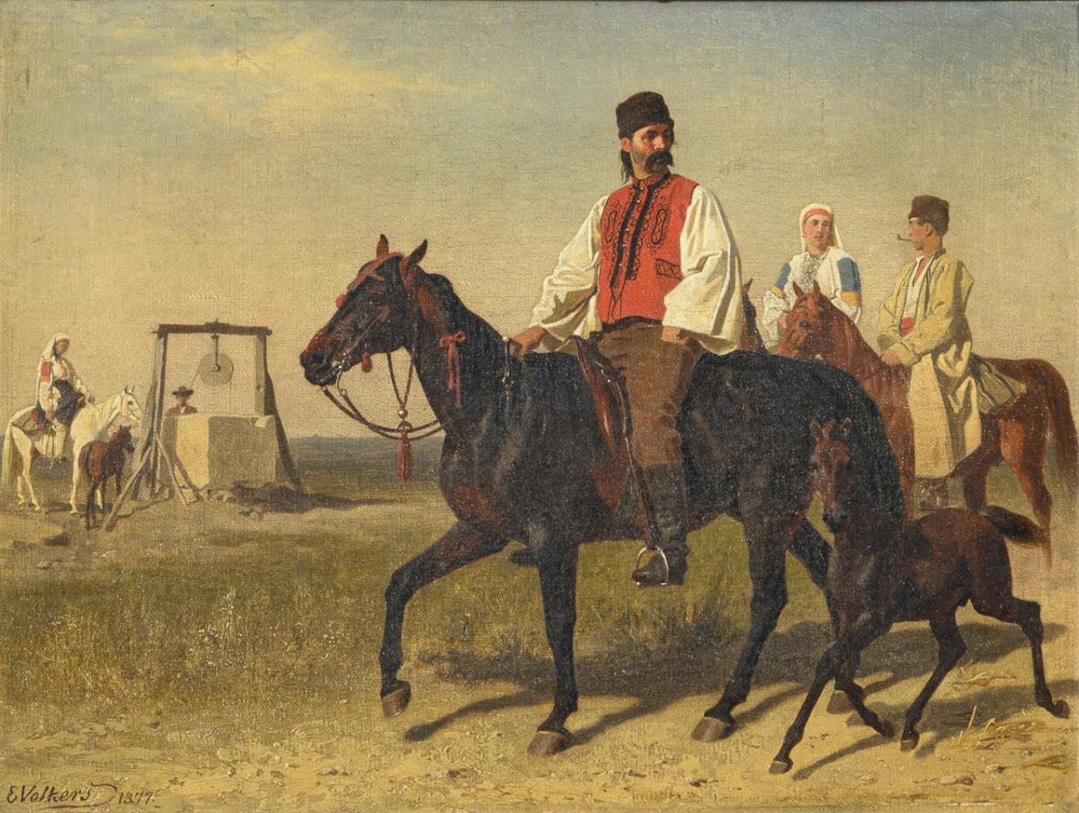 Romanian horsemen at a fountain