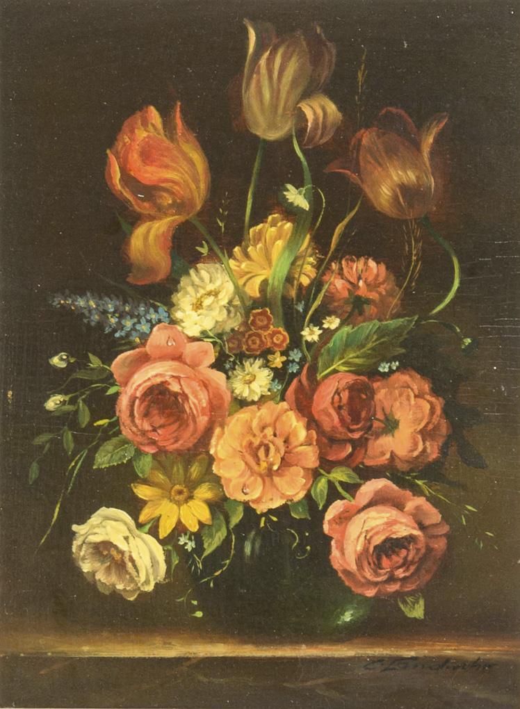 Old masterly painted bouquet of flowers with tulips and roses against a dark background. Slight traces of age.