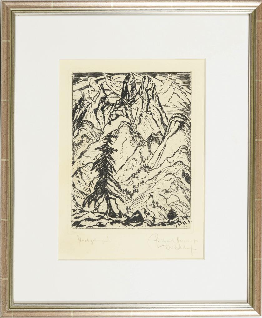 Expressive view of a mountainous, sparsely overgrown landscape with a few conifers, titled in pencil lower left.