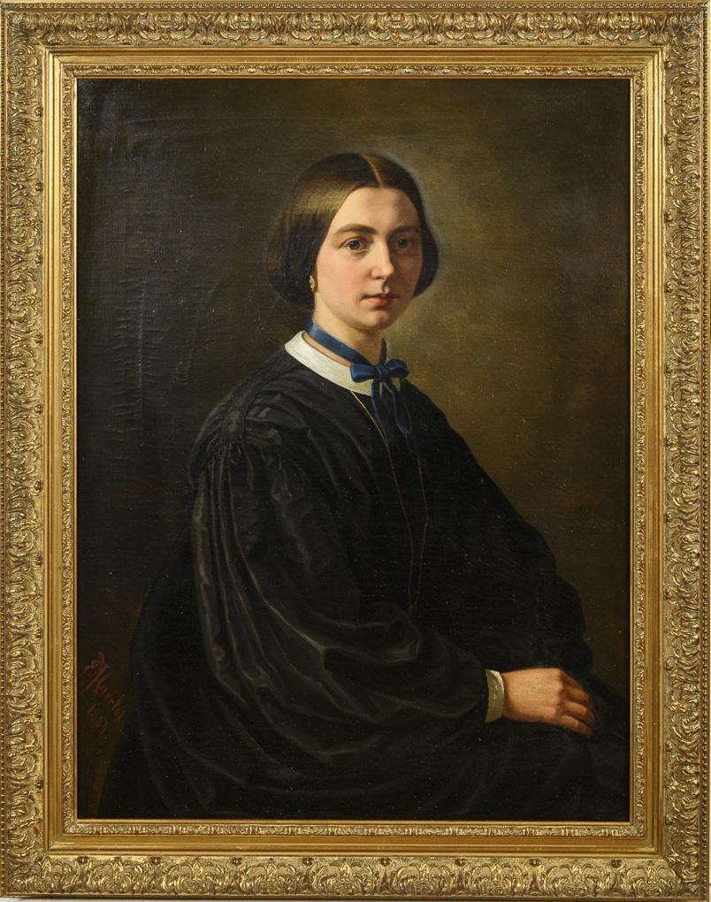 Portrait of a young woman in a black dress with a blue bow and gold chain. Slight traces of age.
